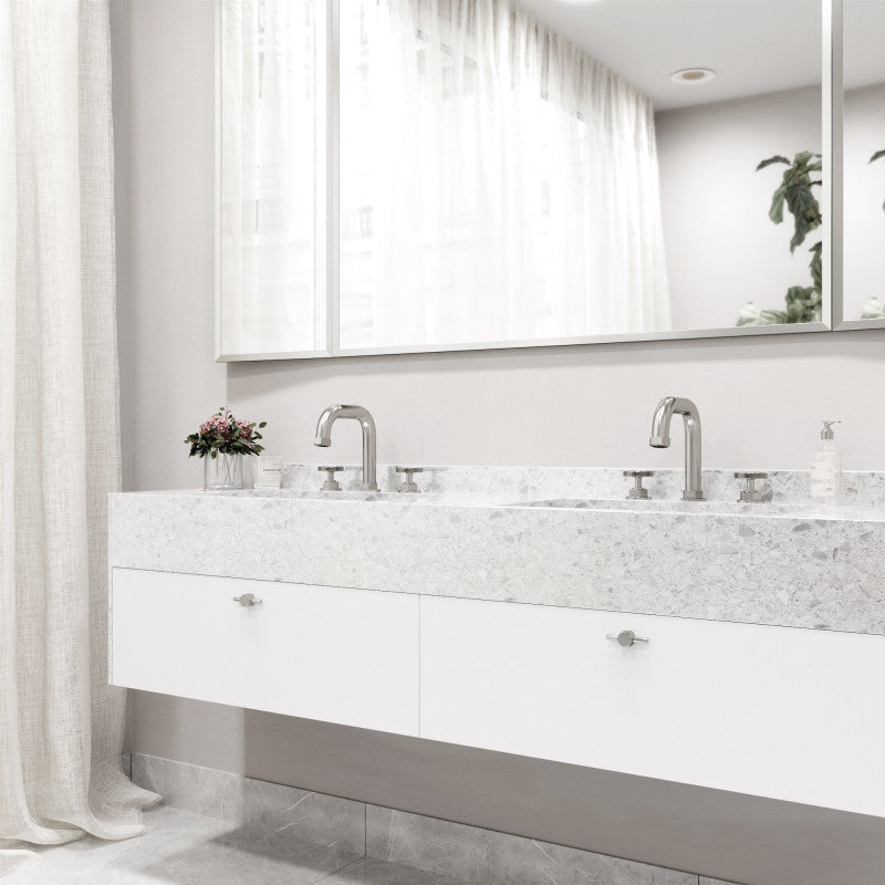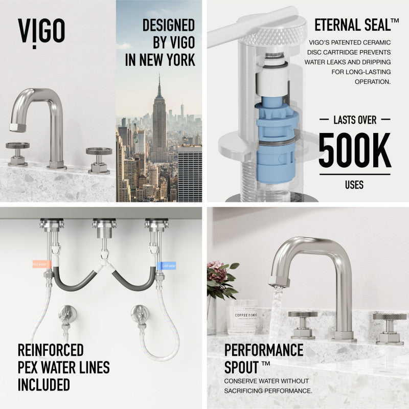 This widespread faucet features an eco-friendly PerformanceSpout™ that conserves water without sacrificing powerful pressure. The removable aerator resists mineral buildup, making this bathroom faucet exceptionally easy to clean and maintain. Inside, the long-lasting EternalSeal™ ceramic cartridge prevents leaks and dripping, with a durable cartridge tested for up to 500,000 uses. The EZInstall™ three-hole installation is designed for easy setup, often requiring no professional assistance. The versatile two-handle design, featuring sleek rounded knob handles, effortlessly complements modern, traditional, or transitional bathroom aesthetics. The FinishPlated™ multi-layered coating is guaranteed to match all VIGO product finishes and is engineered to resist rust, corrosion, and tarnish. Enjoy a powerful yet eco-friendly water flow of 1.2 GPM from this easy-to-clean and spot-resistant finish faucet. Metal braided PEX color-coded waterlines for hot and cold temperature settings are included for straightforward installation.