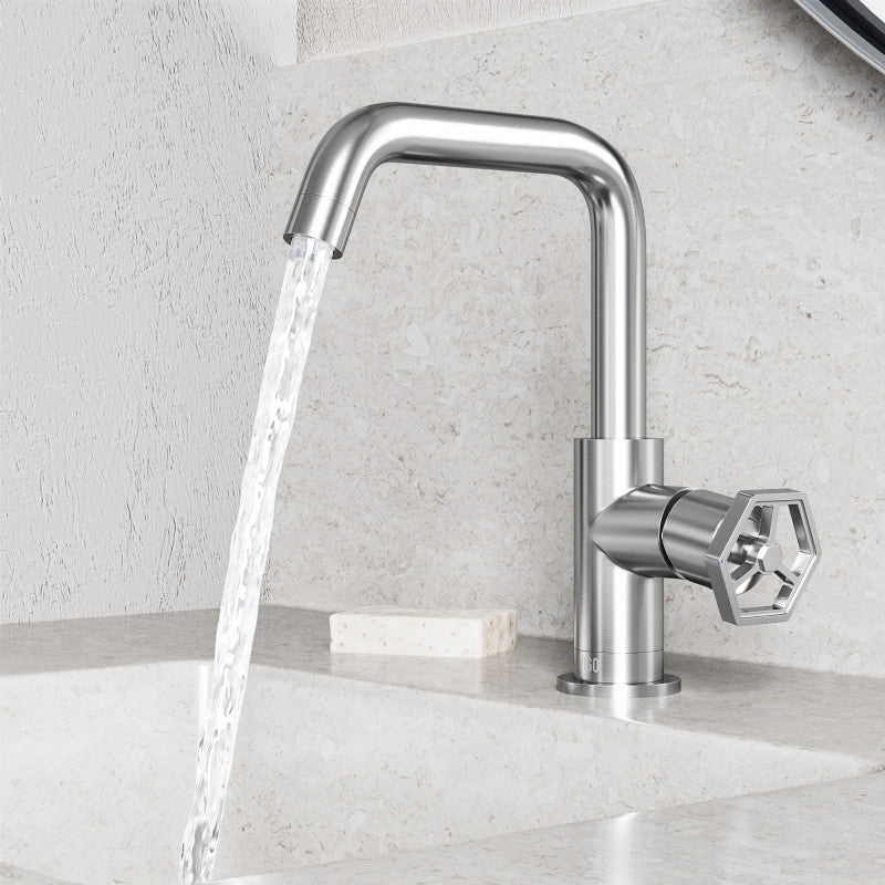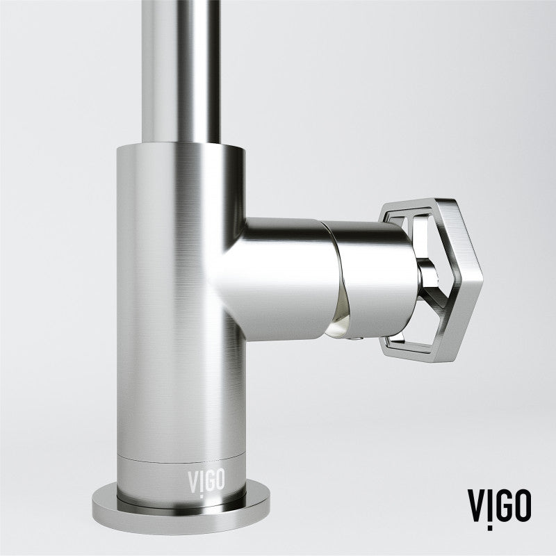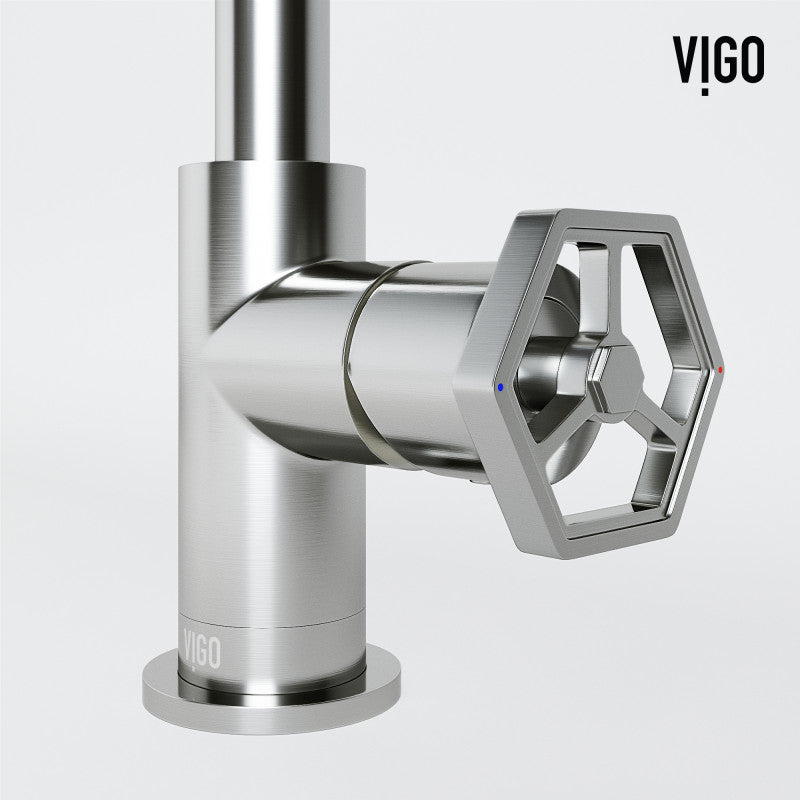 A modern twist on industrial design, The Ruxton Collection from VIGO introduces a striking single-hole bathroom faucet for the sink. The unique single hexagon wheel handle is thoughtfully located on the side of the faucet, offering a distinctive aesthetic. Effortlessly turn the wheel to precisely adjust the water temperature and move the knob to control the water pressure. With a sleek, slim profile and a convenient high arc, this modern bathroom faucet ensures ample space for comfortable hand-washing. The premium finish, available in Brushed Nickel, the timeless shine of Polished Chrome, the bold sophistication of Matte Black, and the warm richness of Brushed Gold, is rust-resistant, and the solid brass construction is exceptionally durable, promising a lifetime of modern luxury.