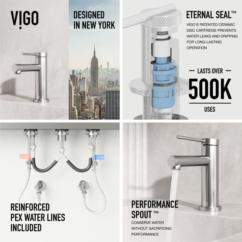 Featuring PerformanceSpout™ technology, this faucet redefines your bathroom experience by seamlessly combining a powerful 1.2 GPM flow with eco-friendly features for effortless rinsing and thorough handwashing. EternalSeal™ technology ensures smooth, leak-free operation for a lifetime. Premium craftsmanship and solid brass construction make this faucet resistant to rust, corrosion, and tarnishing. The splash-free aerator and spout design minimize splashing, reducing water residue and soap scum buildup for quicker cleanups. FinishPlated™ technology guarantees a uniform finish across the entire faucet, ensuring a flawless look that perfectly matches all other VIGO products in the same finish. Self-cleaning spout technology actively prevents mineral buildup, ensuring a consistently clean and steady water flow. EZInstall™ ensures quick setup with standard US 3/8-inch plumbing connections and a single 1-3/8-inch hole requirement. Our complete installation package includes supply lines, an Allen key, instructions, and a protection registration card. Certified efficient, this faucet meets cUPC, NSF-61, NSF-372, WaterSense, and CEC standards. Built to last with a limited lifetime warranty, this bathroom faucet provides peace of mind with its high-quality materials and comprehensive coverage.