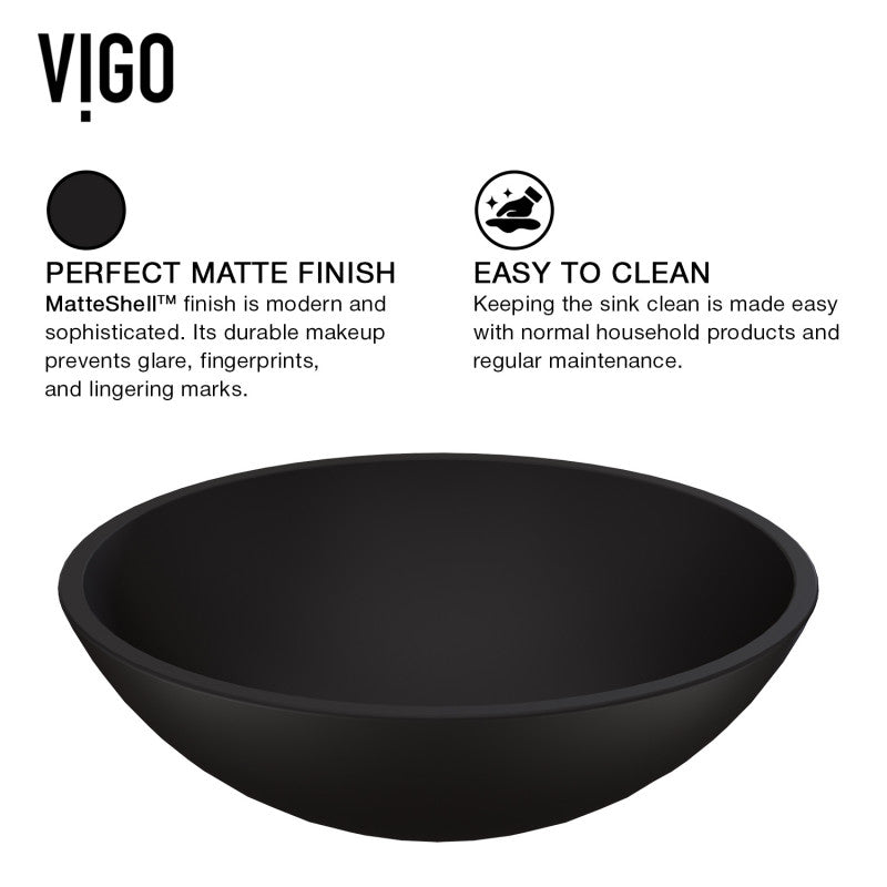 Elegant in form and engineered for resilience, the VIGO Black Cavalli MatteShell™ Vessel Sink redefines modern simplicity. Crafted from reinforced tempered glass, this spherical sink features a rich matte black finish infused throughout the material to prevent chipping and discoloration. Its orb-like silhouette and satin eggshell sheen create visual depth while maintaining a clean, minimalist look. The Cavalli’s smooth, fingerprint-resistant surface and balanced dimensions make it a striking addition to any modern or transitional bathroom.
