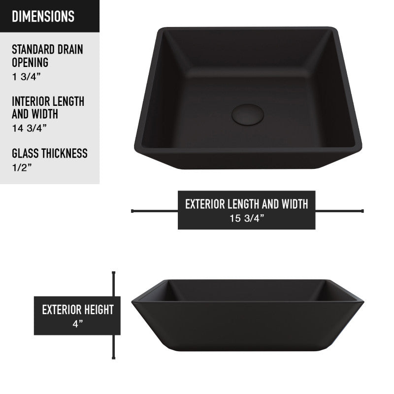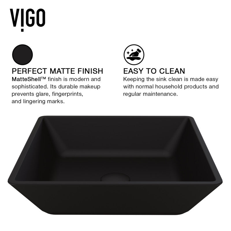 With a bold profile and seamless surface, the VIGO Black Roma MatteShell™ Vessel Sink is where design meets durability. Crafted from reinforced tempered glass, this matte black vessel sink features a soft eggshell sheen and deeply saturated color infused throughout the glass to prevent chipping or fading. Its curved rectangular silhouette offers sculptural dimension and practical ease, while the fingerprint-resistant etched finish ensures it remains as striking as the day it was installed. Designed for above-counter mounting, the Black Roma brings refined presence to any modern or transitional bathroom.