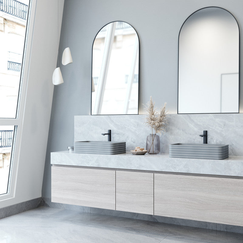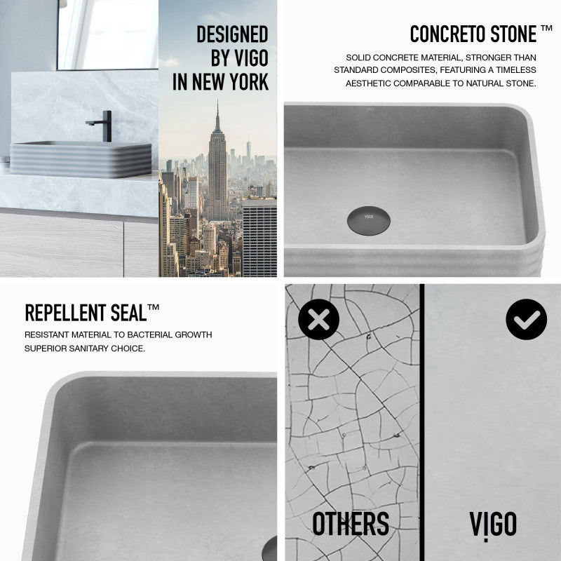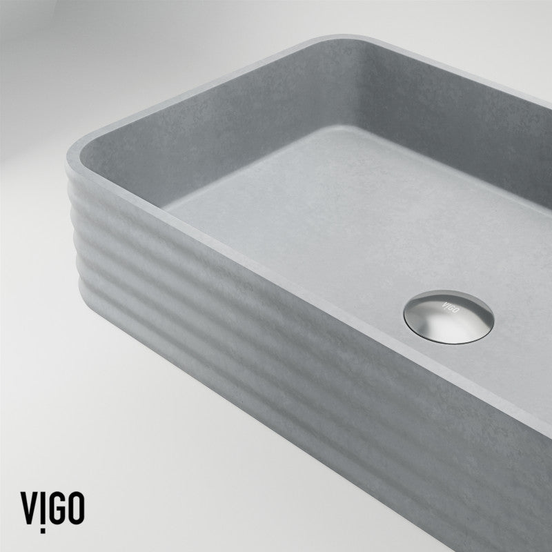 Sophisticated structure meets artisan craftsmanship in the VIGO Cadman Vessel Sink. Handcrafted from VIGO’s proprietary Concreto Stone™ blend, this rectangular sink features subtle fluting and a soft matte grey tone that enhances a wide range of bathroom styles. Made from a concrete and natural material composite, the surface is non-porous, easy to clean, and naturally resistant to bacteria. Available in two size options, the Cadman offers functional elegance with sculptural appeal, designed for above-counter installation in traditional, transitional, or contemporary spaces.