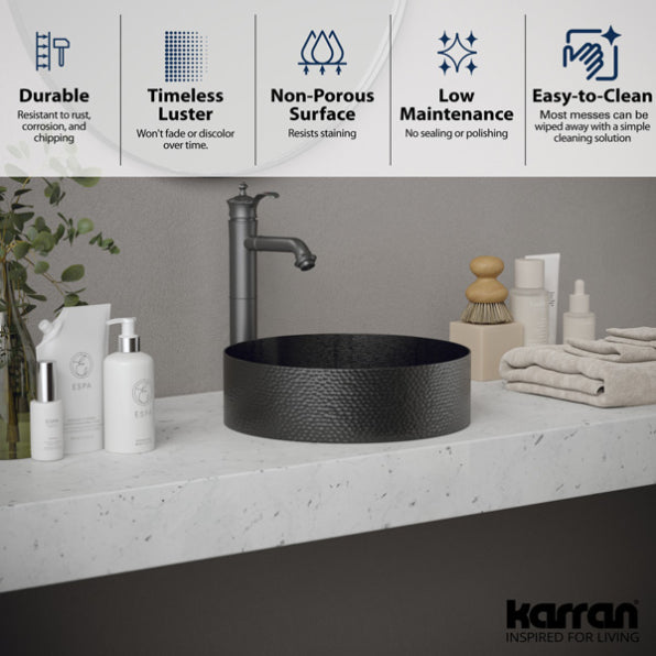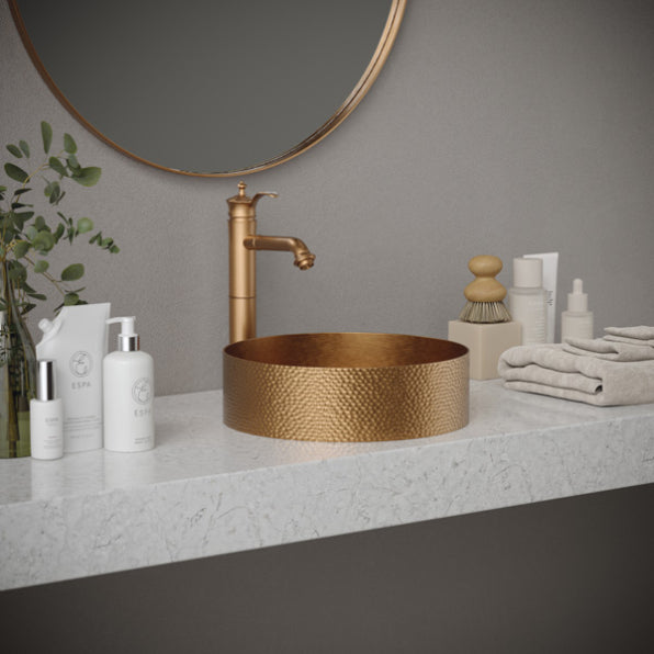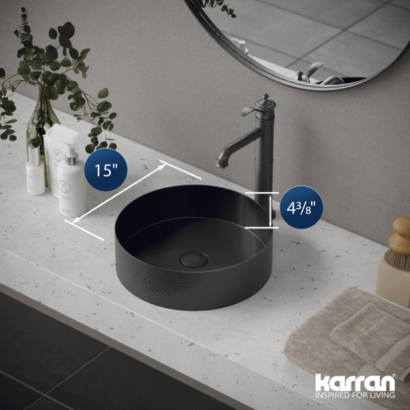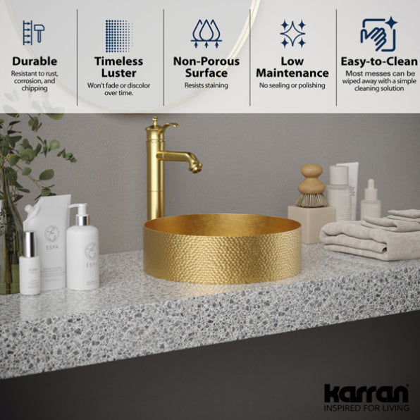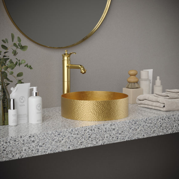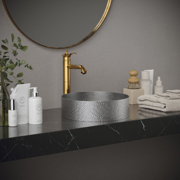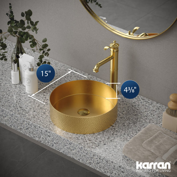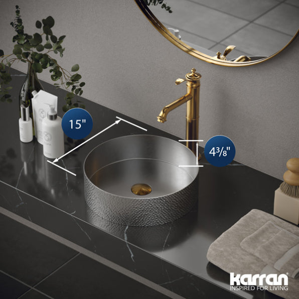 The Cinox Round Hammered Stainless Steel Vessel Bathroom Sink in Gold, Copper, Gunmetal Grey, or Stainless Steel Finish is a striking fusion of functional artistry and luxurious design. This round vessel sink immediately elevates the aesthetic of any bathroom. Crafted from high-quality stainless steel, it combines durability with a shimmering, opulent finish, making it a standout piece in your bathroom.