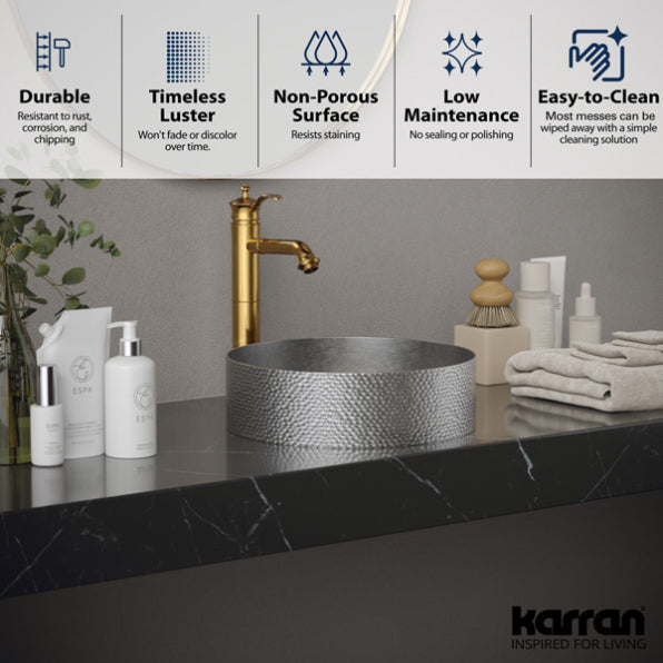 The Cinox Round Hammered Stainless Steel Vessel Sink offers a beautiful balance of luxury and function. Whether you’re redesigning your bathroom or starting from scratch, its striking design and durable construction ensure it remains a statement piece for years to come.