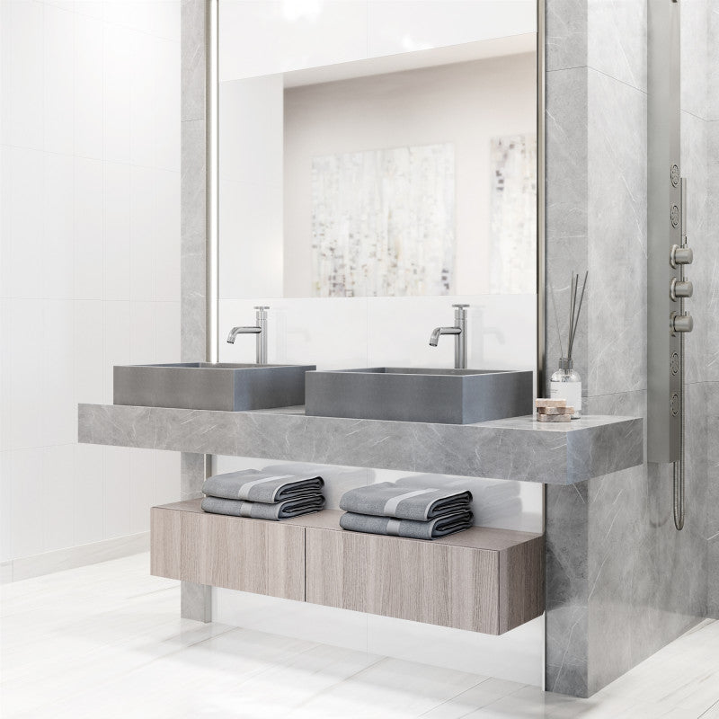 The VIGO Coca Vessel Sink brings artisanal craftsmanship and urban-inspired strength to your bathroom. Handmade from VIGO’s proprietary Concreto Stone™ composite, this rectangular sink combines concrete with natural materials to create a durable, non-porous surface that resists scratches, stains, and bacterial buildup. The Gothic Gray finish and gently rounded corners lend soft contrast to the bold geometric shape, offering a clean and versatile look that pairs seamlessly with vessel or wall-mount faucets. Designed for above-counter installation, the Coca sink blends function, form, and long-lasting performance.