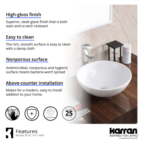 The Devon Vitreous China Vessel Sink combines luxury with practicality, offering a sleek round design and a high-gloss, double-glazed finish. Crafted for above-counter installation, this elegant vanity bowl delivers both visual appeal and exceptional durability. Its non-porous surface ensures easy cleaning, while the sturdy construction offers long-lasting performance, making it a perfect addition to your bathroom.