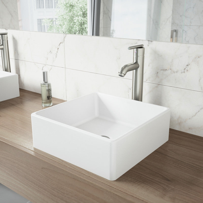 VIGO Dianthus Matte White Square Vessel Sink – Seamless Matte Stone™ with Satin Finish and Geometric Elegance
