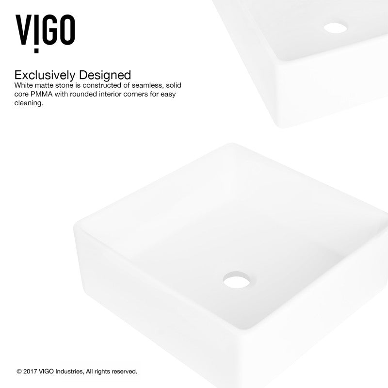 Refined geometry meets everyday performance in the VIGO Dianthus Vessel Sink. Crafted from VIGO’s solid-core Matte Stone™ composite, this square basin offers exceptional durability with a soft satin matte finish that resists scratches, chips, stains, and fading. Its symmetrical shape and smooth, rounded corners bring a clean, modern feel to any vanity, while the non-porous surface ensures easy maintenance. Designed for above-counter installation, the Dianthus delivers a crisp, architectural look that works beautifully across traditional, transitional, and contemporary bathrooms.