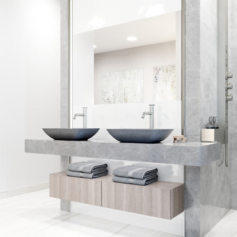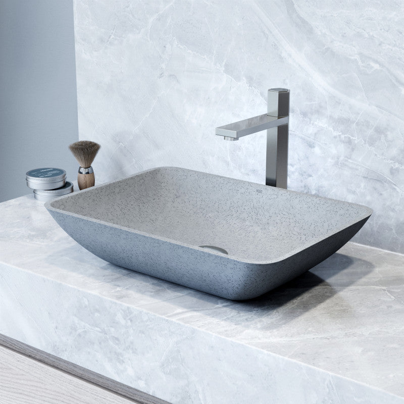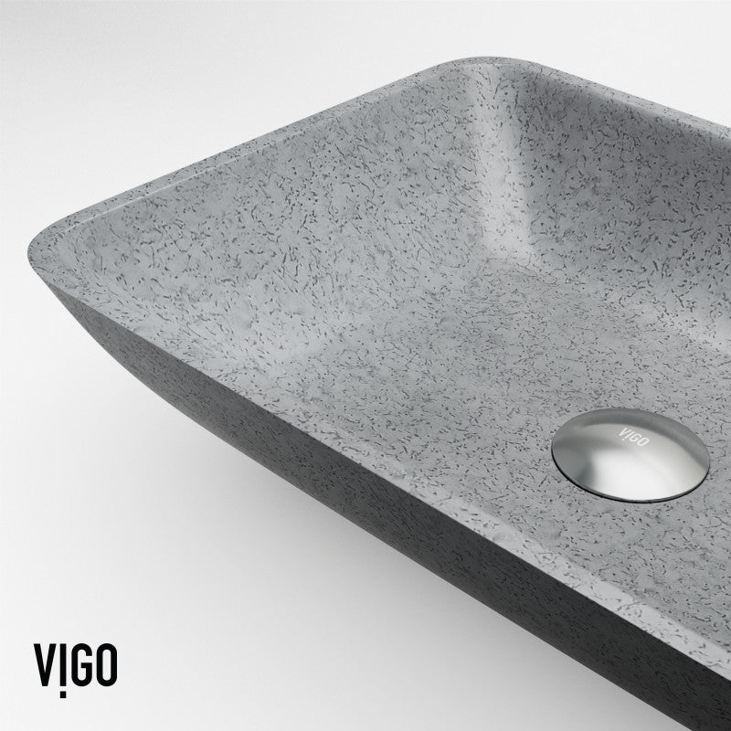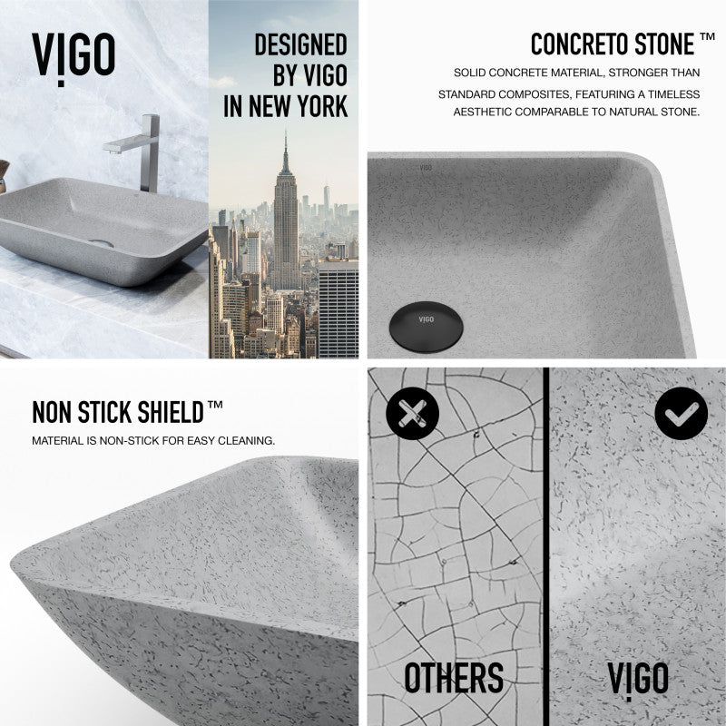 Modern resilience meets timeless form in the VIGO Duomo Vessel Sink. Handcrafted from proprietary Concreto Stone™, this rectangular sink blends concrete with natural materials for exceptional strength and a naturally hygienic surface. The Gothic Grey finish adds depth and sophistication, while softly curved corners provide ease of cleaning and a welcoming silhouette. Ideal for modern, transitional, or traditional bathrooms, the Duomo brings understated elegance and functional design to any countertop.