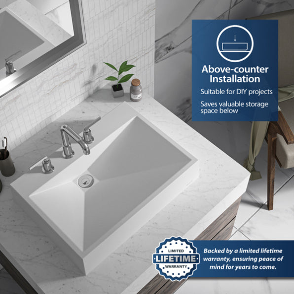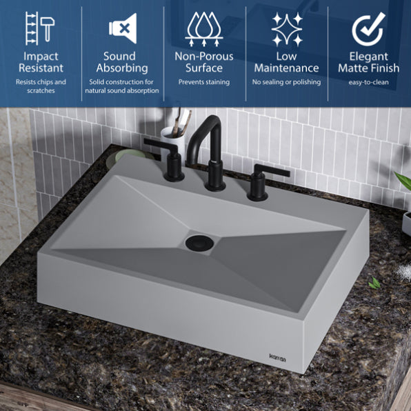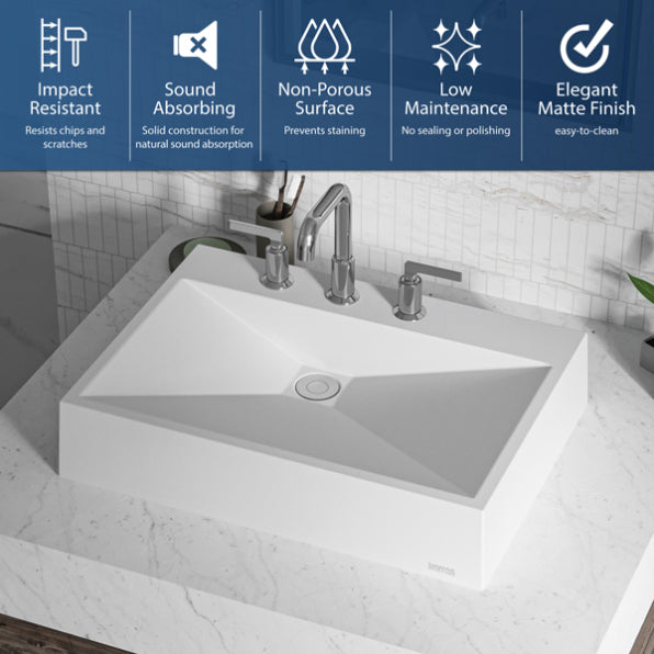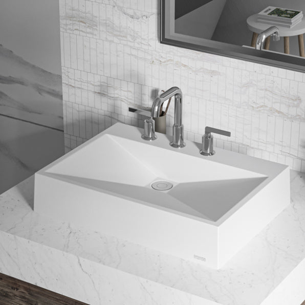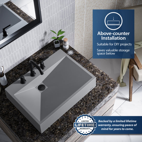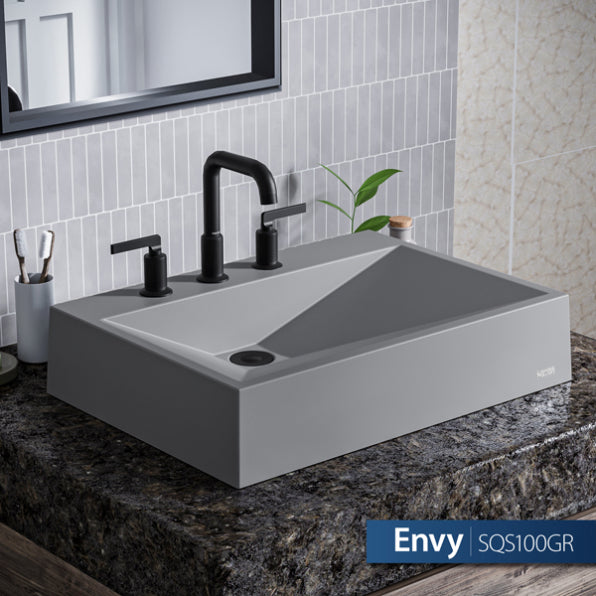 The Envy Quartz Composite Vessel Sink is a bold and modern addition to your bathroom, featuring crisp, linear geometry that creates a striking presence. Crafted from ultra-durable quartz composite and finished with a silky matte surface, this vessel sink combines contemporary design with lasting functionality. Its elegant appearance and easy maintenance make it a perfect choice for any modern bathroom.