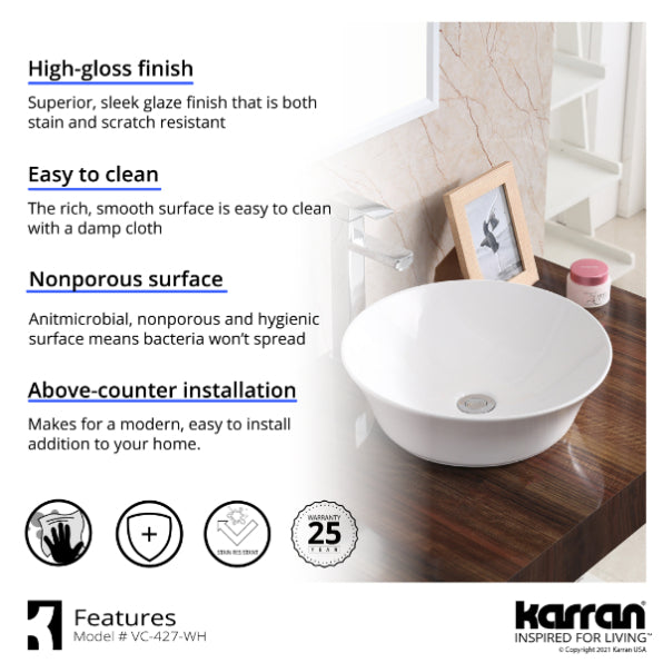The Nottingham Vitreous China Vessel Sink combines style, durability, and functionality. With its sleek circular design and high-gloss, double-glazed finish, the Nottingham sink adds a touch of elegance to any bathroom. This above-counter vessel sink is easy to install, maintain, and clean, offering long-lasting beauty and trouble-free use for years to come.