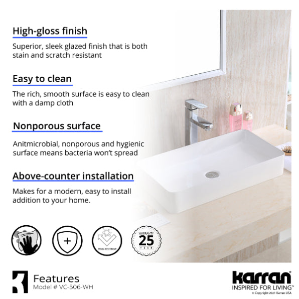 - Above-Counter Installation: Designed for easy above-counter installation, this sink optimizes space below the vanity and adds an elevated, modern look to your bathroom.