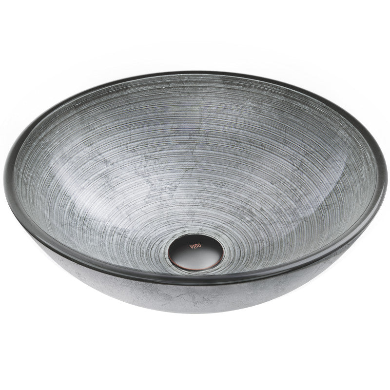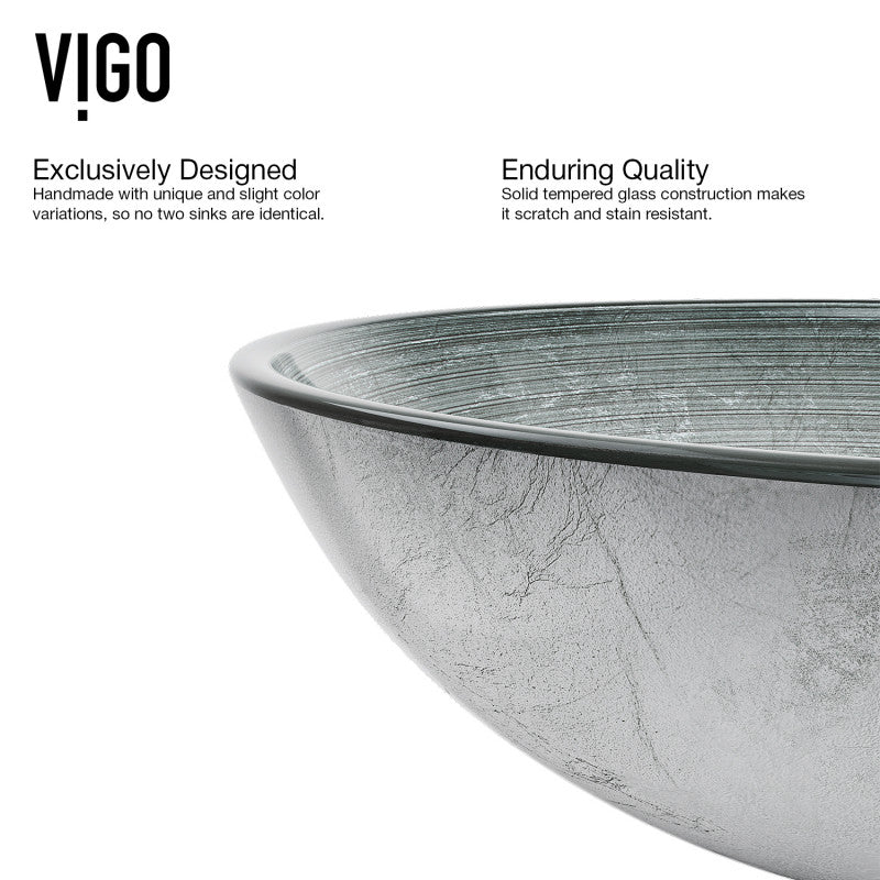 Add shimmer and artistry to your bathroom with the VIGO Simply Silver Vessel Sink, a striking basin handcrafted from solid tempered glass. The interior showcases a soft, brushed silver pattern while the exterior features a lightly marbled texture that captures and reflects light in elegant layers. Made for above-counter installation, this vessel sink is as durable as it is distinctive, with a scratch-resistant, non-porous surface that resists stains from cosmetics and daily use. Its handcrafted nature means no two pieces are exactly alike, creating a one-of-a-kind centerpiece for any modern or transitional bath.