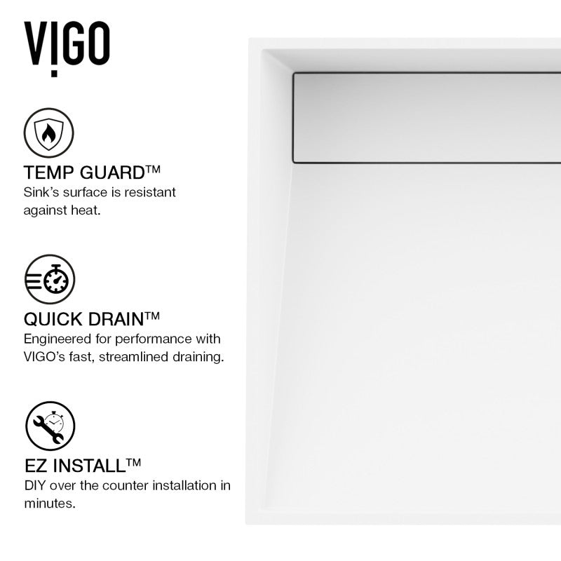 Modern luxury meets timeless design in the VIGO Starr Grand Vessel Sink, a striking rectangular basin crafted from solid-core Matte Stone™. Inspired by European sculpture, this sink’s clean white surface, rounded interior, and elegant drain plate deliver both form and function. The proprietary Matte Stone™ material is smoother, stronger, and more durable than fireclay or ceramic, and it’s naturally resistant to stains, bacteria, and everyday wear. With its generous dimensions and subtle details, the Starr Grand creates a serene and sculptural focal point for contemporary and transitional bath spaces.