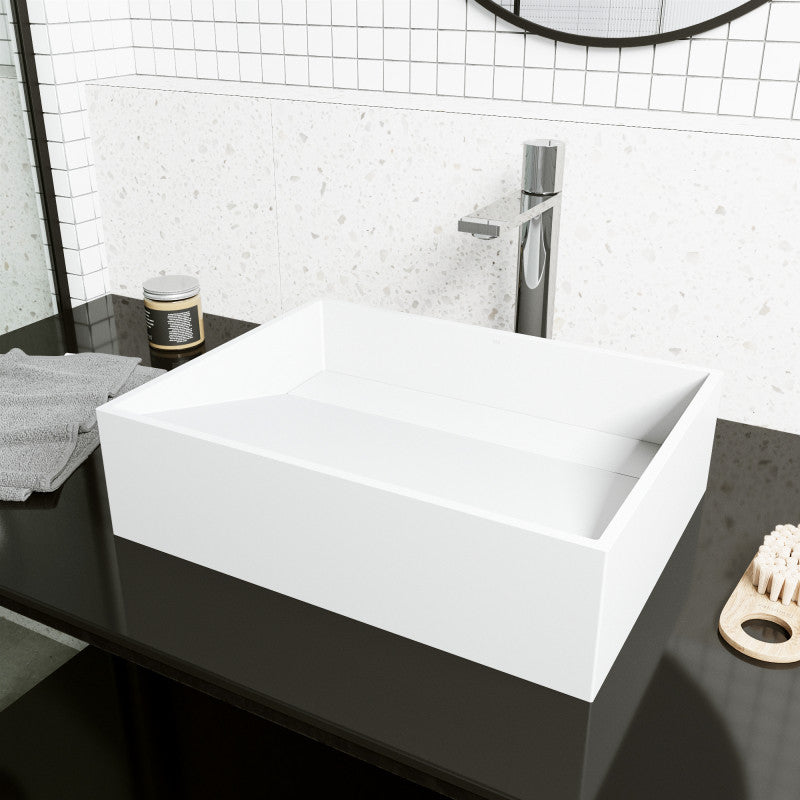 Sleek and sophisticated, the VIGO Starr Vessel Sink brings sculptural elegance to everyday functionality. Inspired by the artistry of European sculpture and New York City’s finest design museums, this compact rectangular sink is crafted from VIGO’s solid-core Matte Stone™ composite. The seamless matte white surface is naturally non-porous, hygienic, and built to outperform traditional ceramic or fireclay. A discreet drain plate preserves the minimalist basin design while offering easy cleaning and fast, complete drainage. Compact in size yet bold in aesthetic, the Starr sink is an ideal fit for powder rooms and modern bath spaces alike.