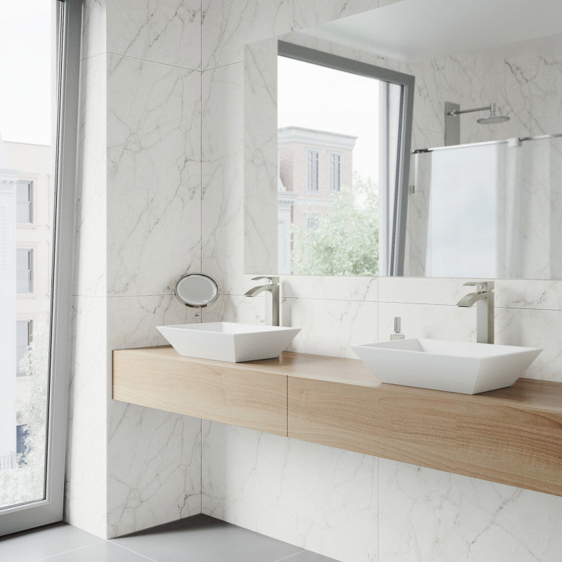 Let clean lines and lasting materials take center stage. The VIGO Vinca vessel sink offers a fresh take on classic rectangular design, elevating your vanity with subtle sophistication and enduring performance.