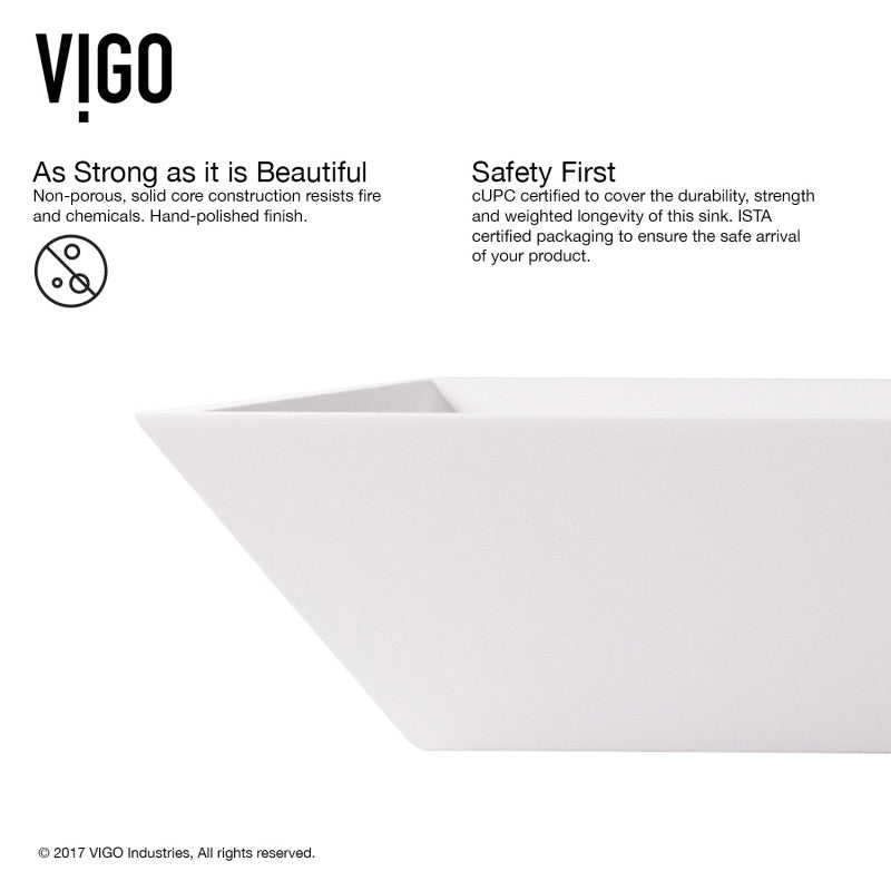 Redefine your bathroom’s style with the sleek and durable VIGO Vinca Vessel Sink, crafted from solid-core Matte Stone™. With its rectangular silhouette, soft rounded corners, and satin-smooth matte white finish, this sink creates a crisp, architectural presence that feels both refined and approachable. Built from a non-porous composite that resists scratches, fading, and discoloration, the Vinca combines long-term performance with minimalist sophistication. Its above-counter design adds height and visual interest to vanities across traditional, transitional, and contemporary spaces.