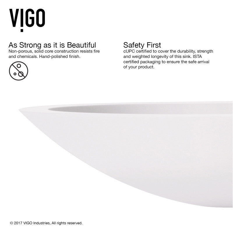 Elevate your bathroom with the refined elegance of the VIGO Wisteria Matte Stone™ Vessel Sink. Crafted from VIGO's signature solid-core Matte Stone™ composite, this smooth white oval vessel sink combines minimalist sophistication with exceptional durability. Its non-porous, hand-polished finish resists scratches, fading, and discoloration—making it an ideal choice for high-use powder rooms and luxury spa-inspired baths alike. Designed for above-counter installation, the Wisteria offers a modern, sculptural presence that effortlessly complements transitional, contemporary, and even traditional interiors.