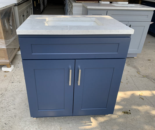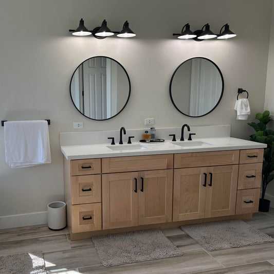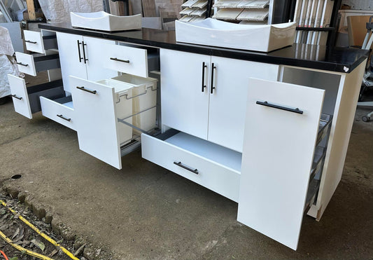 Love this vanity - it was easy to install and looks great. Slight gap in between the two cabinets, but we don't mind too much. The seamless sinks & countertop are beautiful. Drawer space isn't amazing, but the soft close features and deep cabinets make up for it