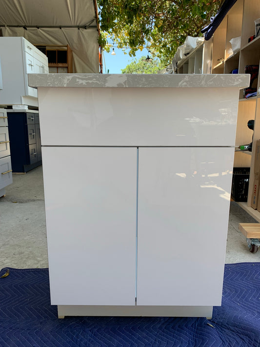 It's beautiful. Fits the room design perfectly. The high gloss makes it look very high end. People are going NUTS over the vanity. Only caution is we had to cut a slot for plumbing in shelf.