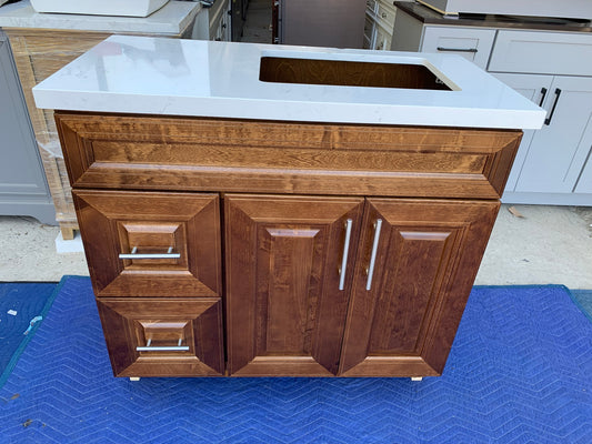 Love this vanity - it was easy to install and looks great. Slight gap in between the two cabinets, but we don't mind too much. The seamless sinks & countertop are beautiful. Drawer space isn't amazing, but the soft close features and deep cabinets make up for it