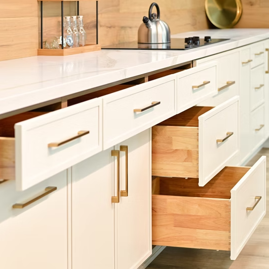 Love this vanity - it was easy to install and looks great. Slight gap in between the two cabinets, but we don't mind too much. The seamless sinks & countertop are beautiful. Drawer space isn't amazing, but the soft close features and deep cabinets make up for it