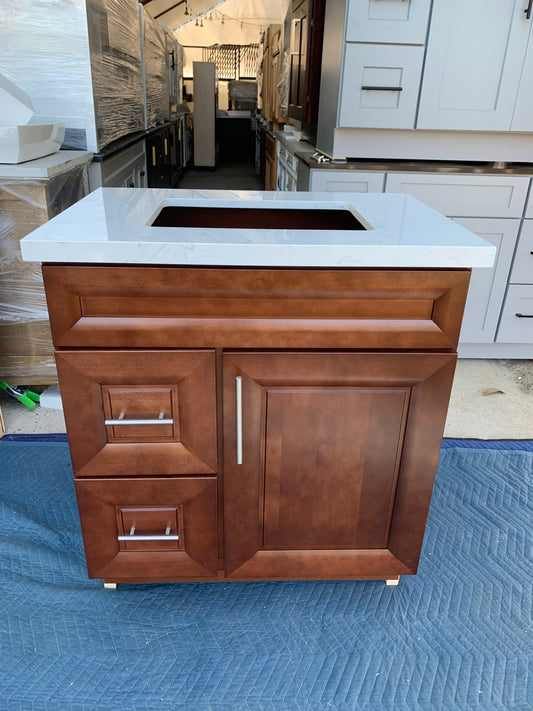 Love this vanity - it was easy to install and looks great. Slight gap in between the two cabinets, but we don't mind too much. The seamless sinks & countertop are beautiful. Drawer space isn't amazing, but the soft close features and deep cabinets make up for it