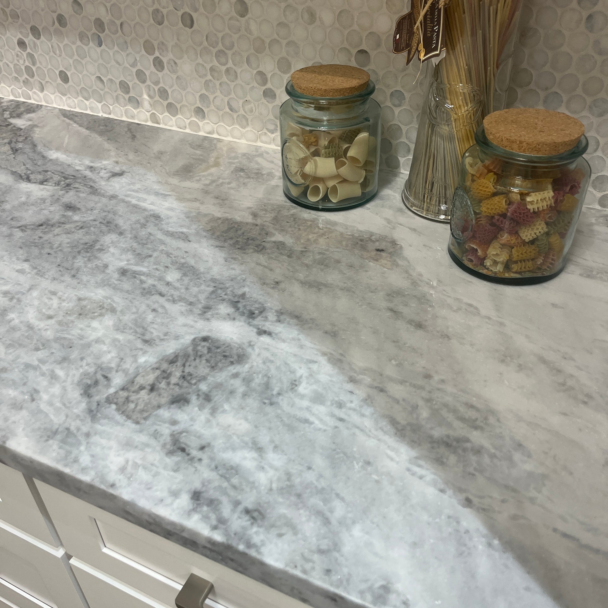 Balance modern calm and subtle drama with Grigio Fantasy Quartzite, a polished natural stone that blends visual texture with everyday durability.