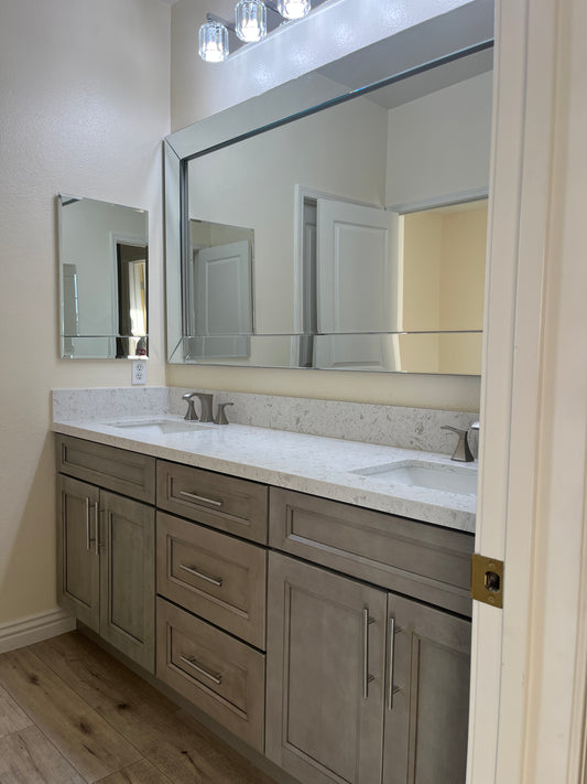 Love this vanity - it was easy to install and looks great. Slight gap in between the two cabinets, but we don't mind too much. The seamless sinks & countertop are beautiful. Drawer space isn't amazing, but the soft close features and deep cabinets make up for it