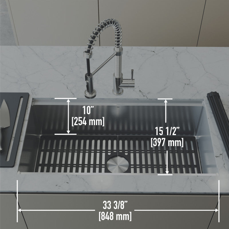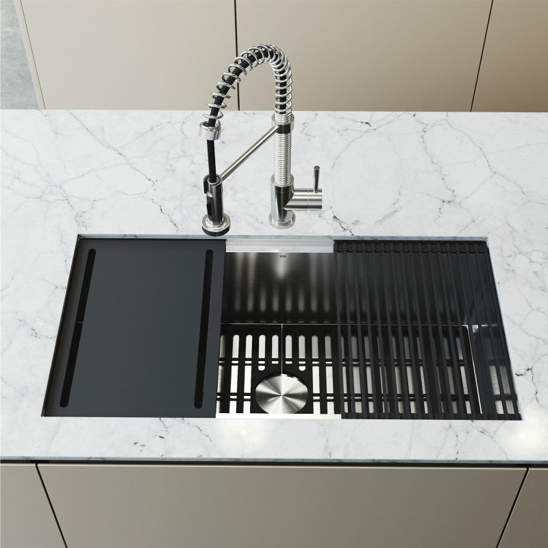 The VIGO Mercer 36-Inch Undermount Workstation Sink is a modern solution for kitchens that demand seamless design and efficient performance. Engineered with an integrated ledge and a full suite of sliding accessories, this sink transforms into a multi-functional prep station that saves counter space while elevating your workflow. Its undermount design keeps surfaces clean and uninterrupted, while the commercial-grade stainless steel ensures long-lasting performance with a professional finish.