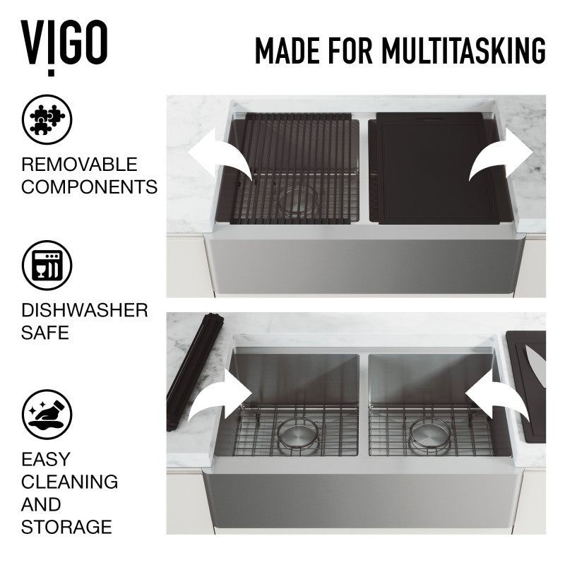 Crafted for everyday multitasking and styled for timeless appeal, the VIGO 33-Inch Oxford Double Bowl Apron Front Farmhouse Sink delivers compact dual-bowl functionality with a clean, modern silhouette. Its smooth flat apron front pairs seamlessly with a variety of kitchen aesthetics, while the included workstation accessories and quiet performance design make it an ideal centerpiece for smaller kitchens that don’t compromise on efficiency.