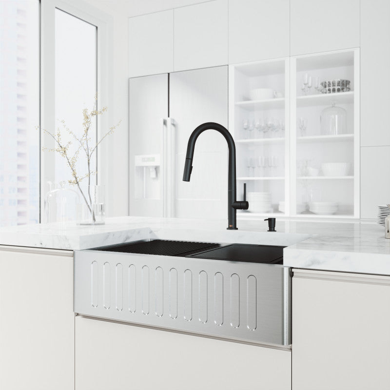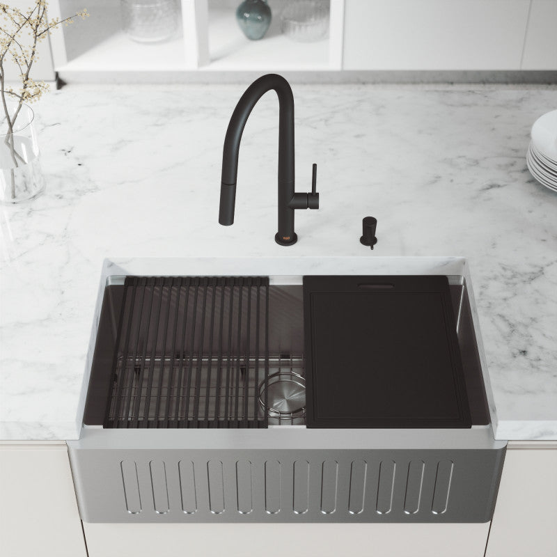 Bring streamlined sophistication to compact kitchens with the VIGO Oxford 33-Inch Sink. Its space-conscious design and integrated features create a cooking environment that is both efficient and beautifully refined.
