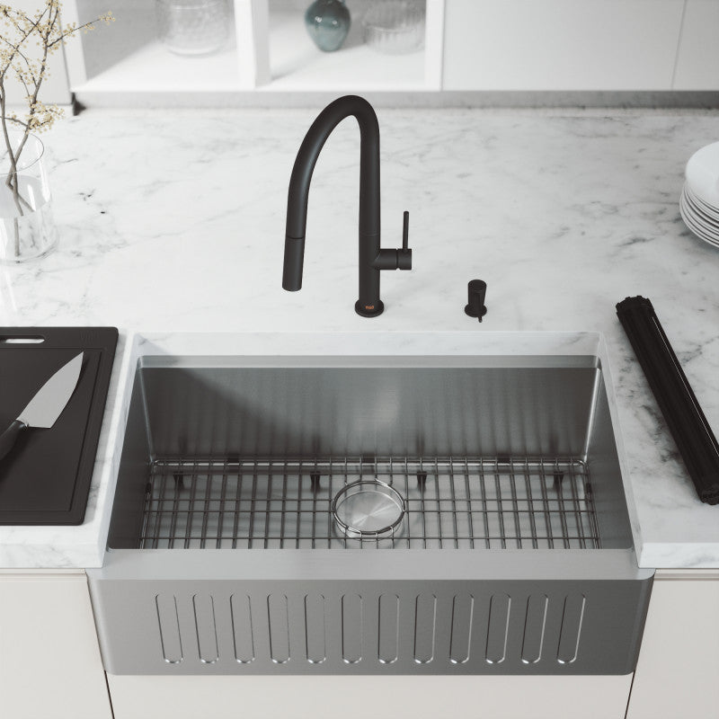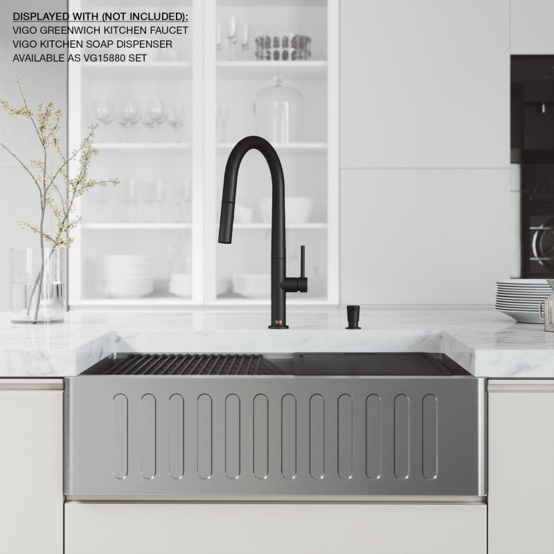 Compact yet boldly designed, the VIGO 33-Inch Oxford Slotted Apron Front Farmhouse Sink delivers both striking aesthetics and reliable performance in one versatile package. Crafted from high-grade 304 stainless-steel, this single-bowl sink features a signature slotted apron front that enhances visual depth while optimizing your kitchen’s functionality. Complete with workstation-ready accessories, it offers a seamless prep and clean experience for smaller kitchens that demand high-impact design.