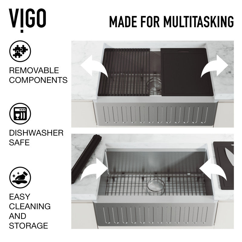 Bring refined utility and striking visual detail to your kitchen with the VIGO 36-Inch Oxford Slotted Apron Front Farmhouse Sink. Crafted from premium 304 stainless steel, its slotted apron design adds a distinct architectural character while seamlessly blending into modern, transitional, or industrial-style spaces. Engineered for daily performance, this single-bowl sink comes fully equipped with custom-fit accessories to streamline your workflow, perfect for culinary enthusiasts and design-forward renovators alike.