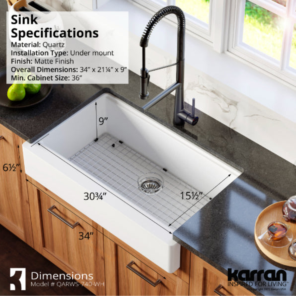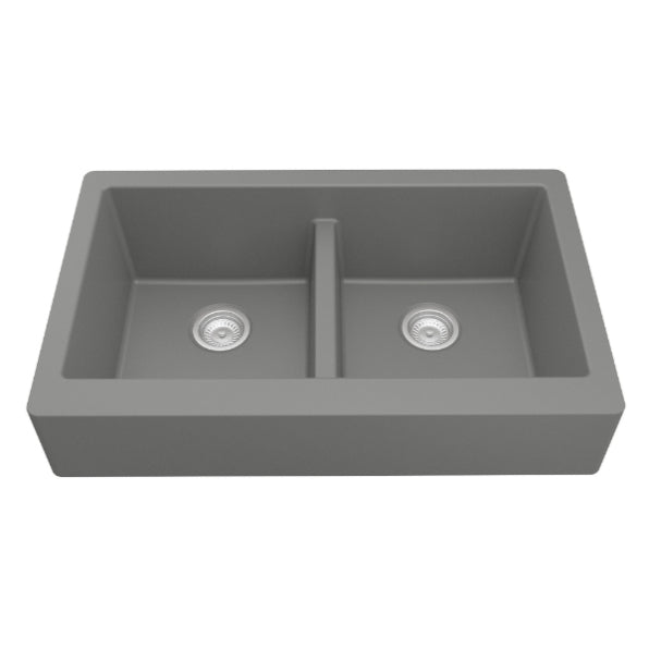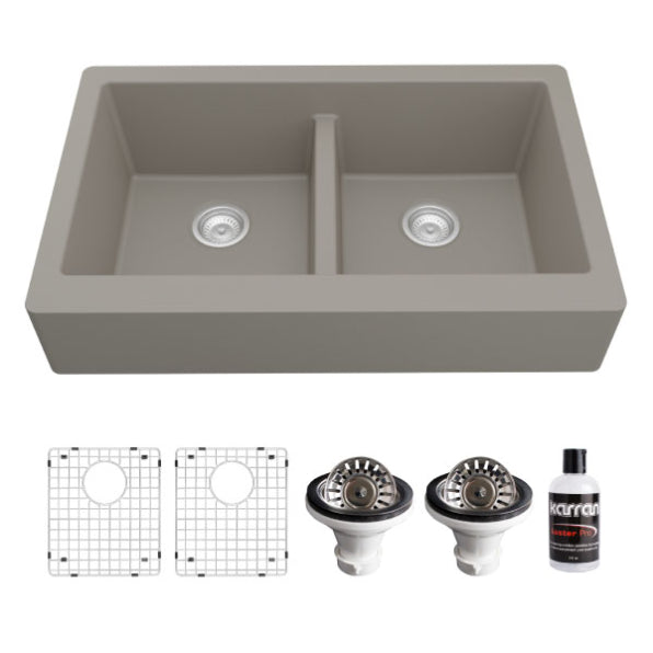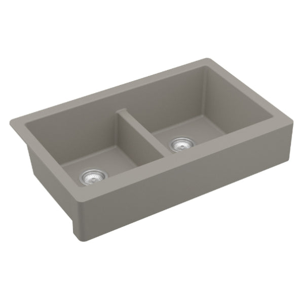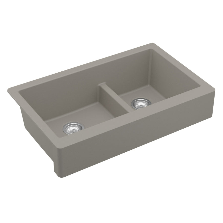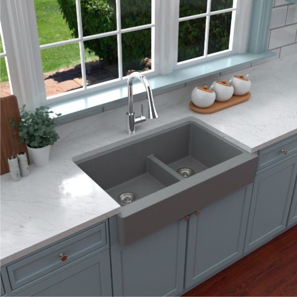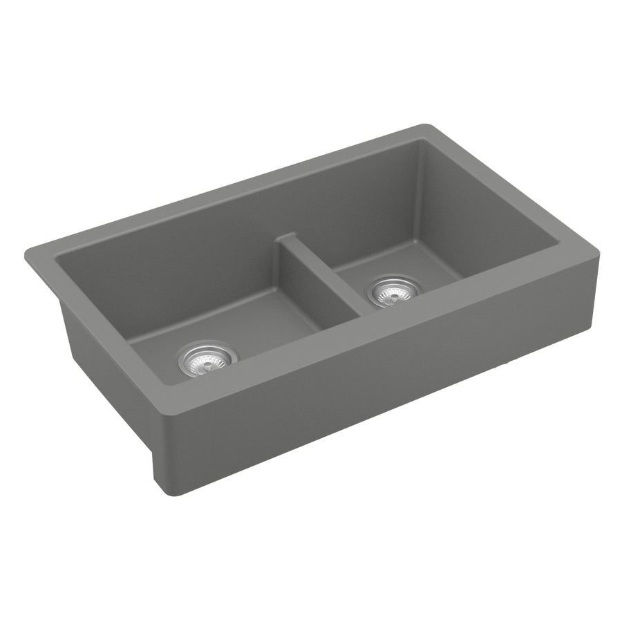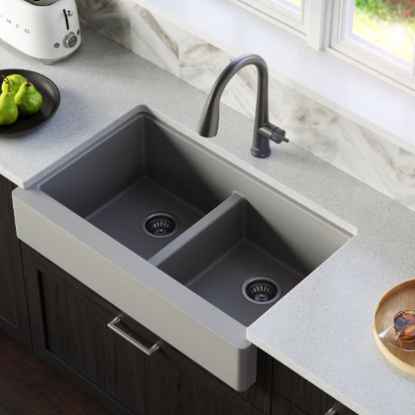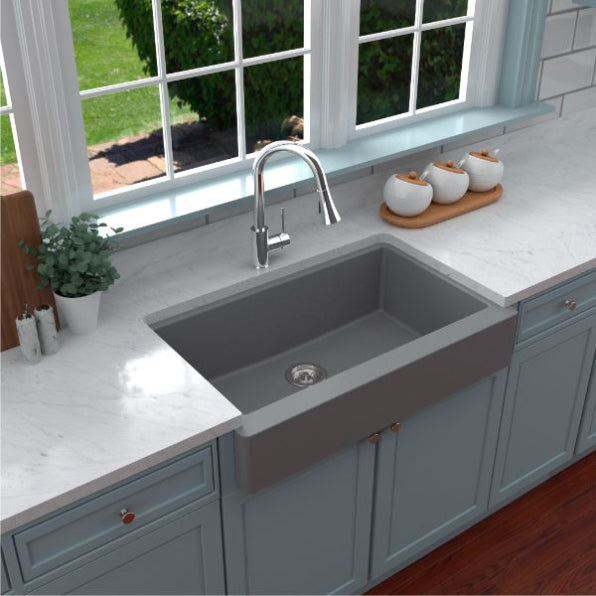 Upgrade your kitchen with the Petrodust 34" Quartz Composite Sink, designed with a bold low-profile apron that fits standard 36" sink bases. Crafted from ultra-durable quartz composite and available in six matte finishes, this farmhouse-style sink offers a choice of single or double bowl configurations. Pair it with optional sink grids or a full workstation setup for added versatility and a refined, modern farmhouse look.