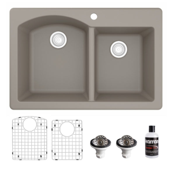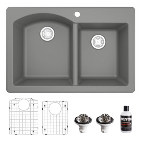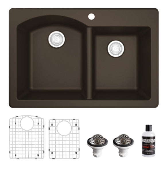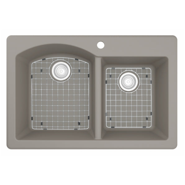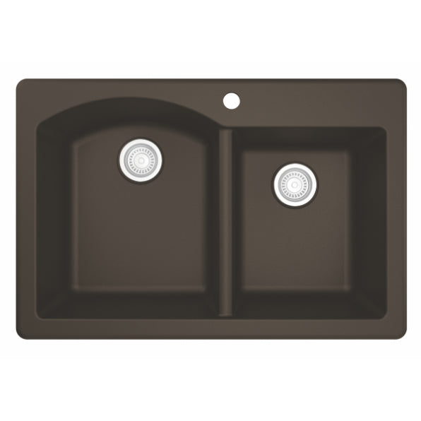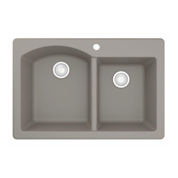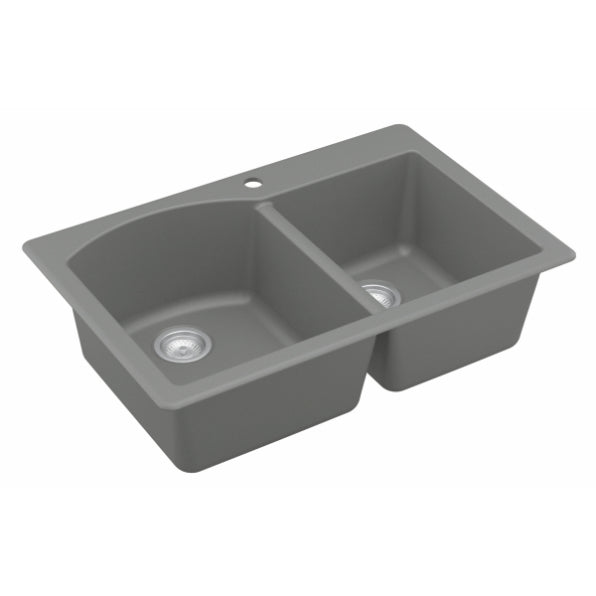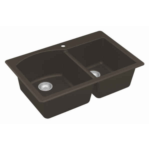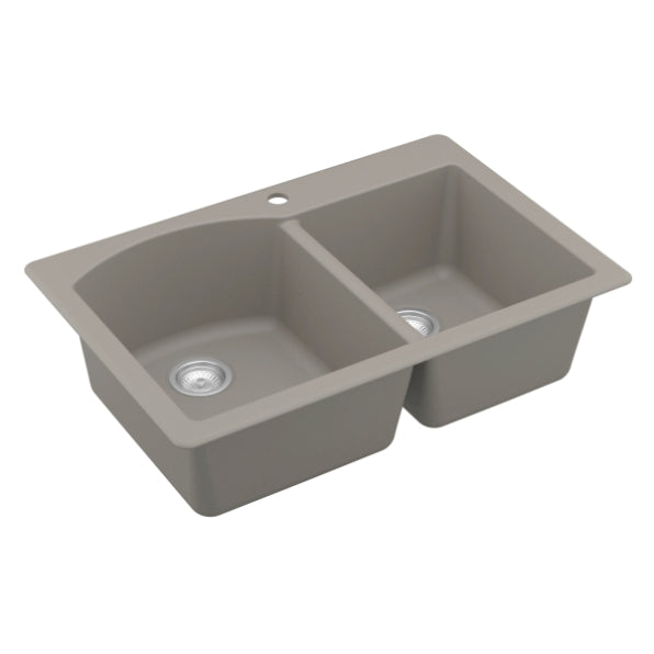 Designed for busy kitchens, the Stonera 32" Quartz Composite Sink features a dual-basin configuration with a curved divider for added elegance and functionality. Its naturally hygienic quartz surface resists stains and scratches while maintaining long-term color integrity. Available in rich neutral tones, this top mount design blends effortlessly with a wide range of kitchen styles.