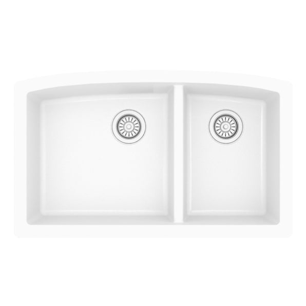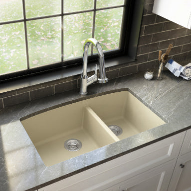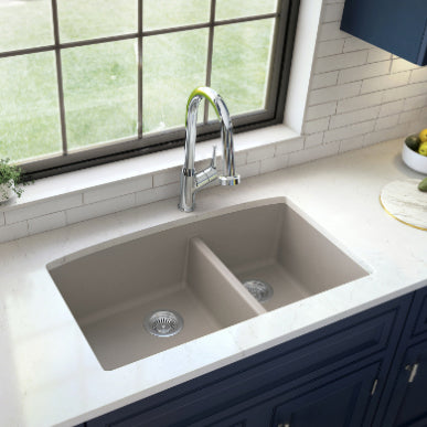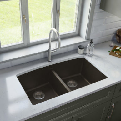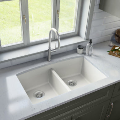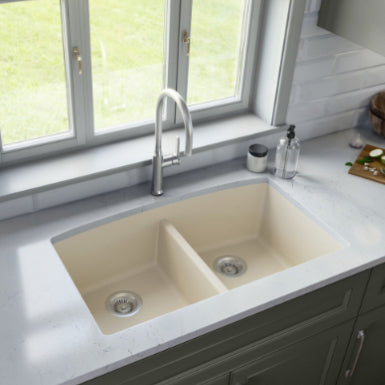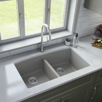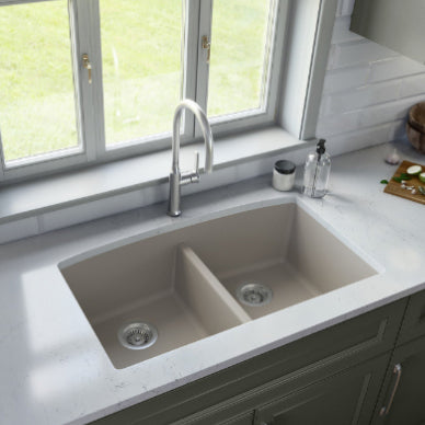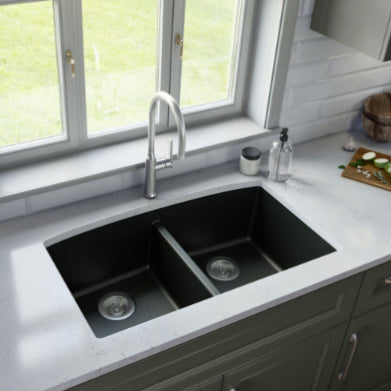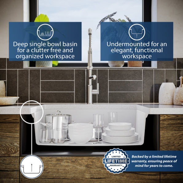 The Tudor 33" Undermount Sink blends refined curves with quartz composite strength for a sink that’s both visually striking and built to last. Its curved rear wall detail adds sculptural interest, while the undermount design provides a seamless transition from counter to sink in granite, quartz, or solid surfaces.