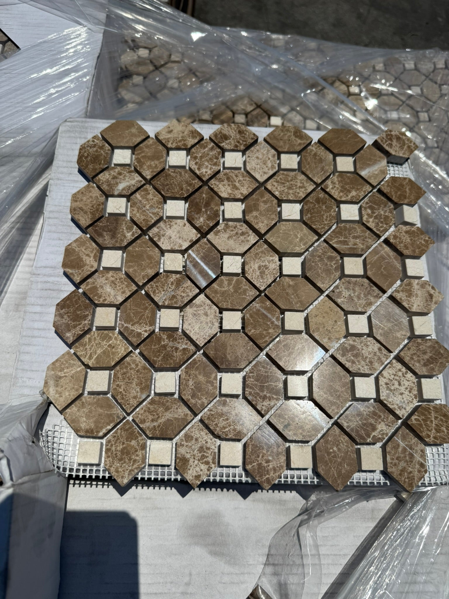 Premium Quality SPANISH EMPERADOR DARK MARBLE POLISHED OCTAGON MOSAIC TILE w/ CREMA MARFIL DOTS