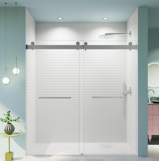 [CLEARANCE] 56-60" W x 76" H Shower Door, Double Sliding Frameless Shower Door with Premium 3/8 Inches (10mm) Thick SGCC Tampered Glass, Soft Close, Explosion-Proof Film