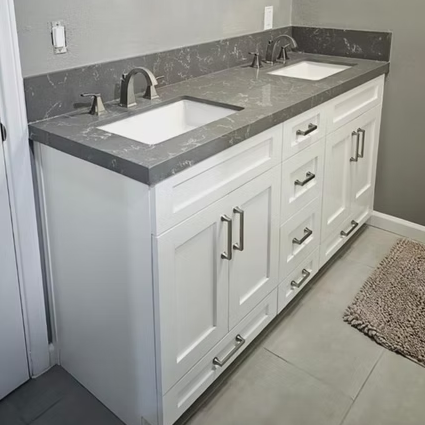 Love this vanity - it was easy to install and looks great. Slight gap in between the two cabinets, but we don't mind too much. The seamless sinks & countertop are beautiful. Drawer space isn't amazing, but the soft close features and deep cabinets make up for it