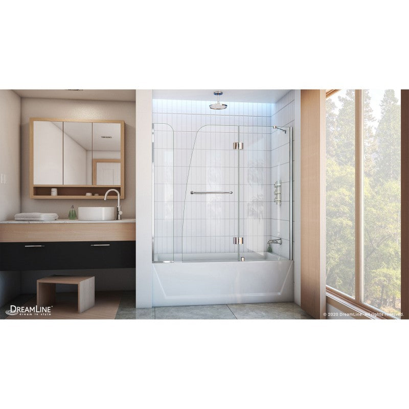 Aqua Frameless Hinged Tub Door with Curved Glass and Extender Panel in Polished Chrome, Brushed Nickel, Oil Rubbed Bronze, and Satin Black