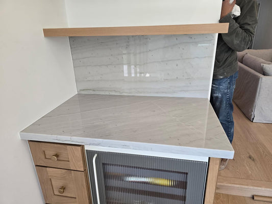Love this vanity - it was easy to install and looks great. Slight gap in between the two cabinets, but we don't mind too much. The seamless sinks & countertop are beautiful. Drawer space isn't amazing, but the soft close features and deep cabinets make up for it