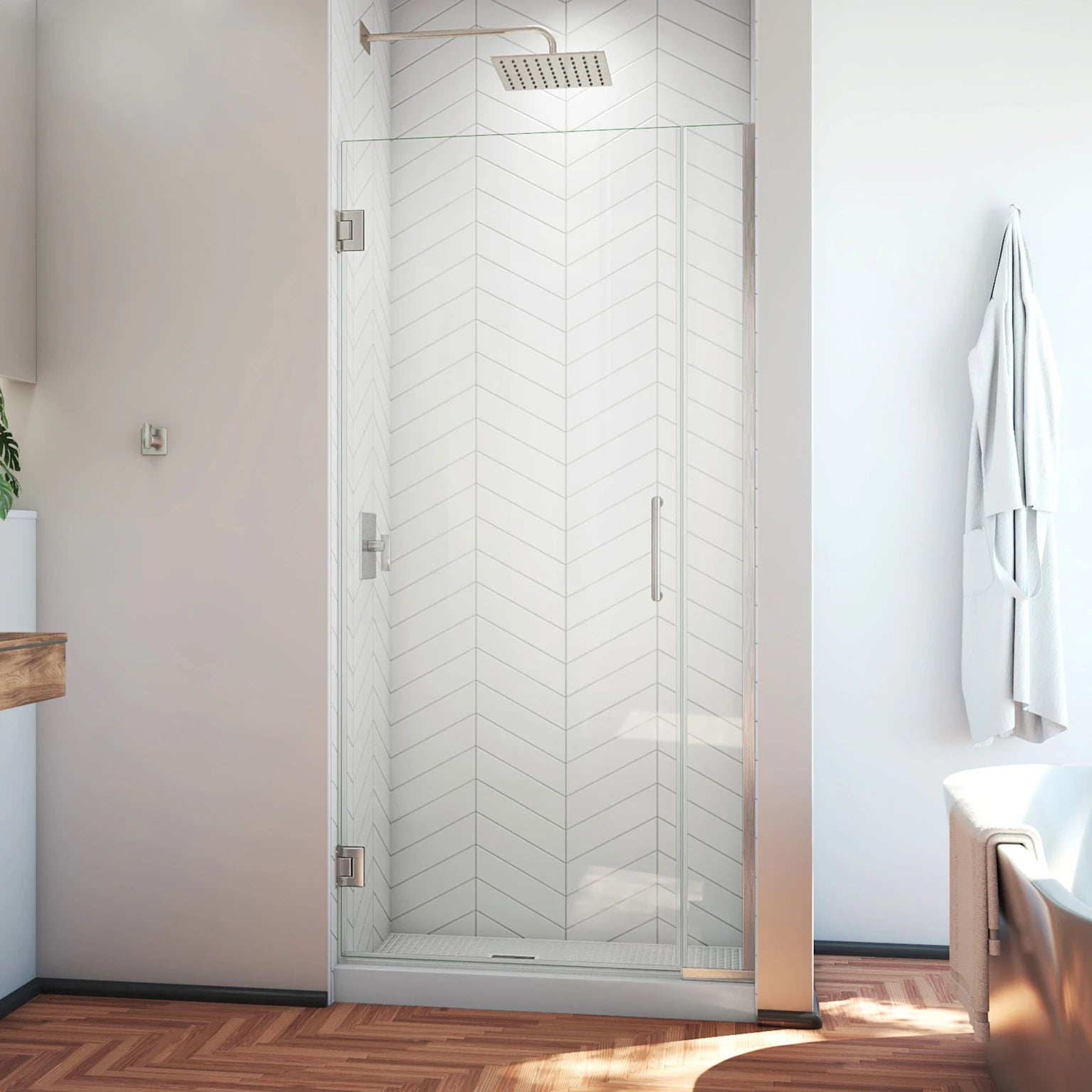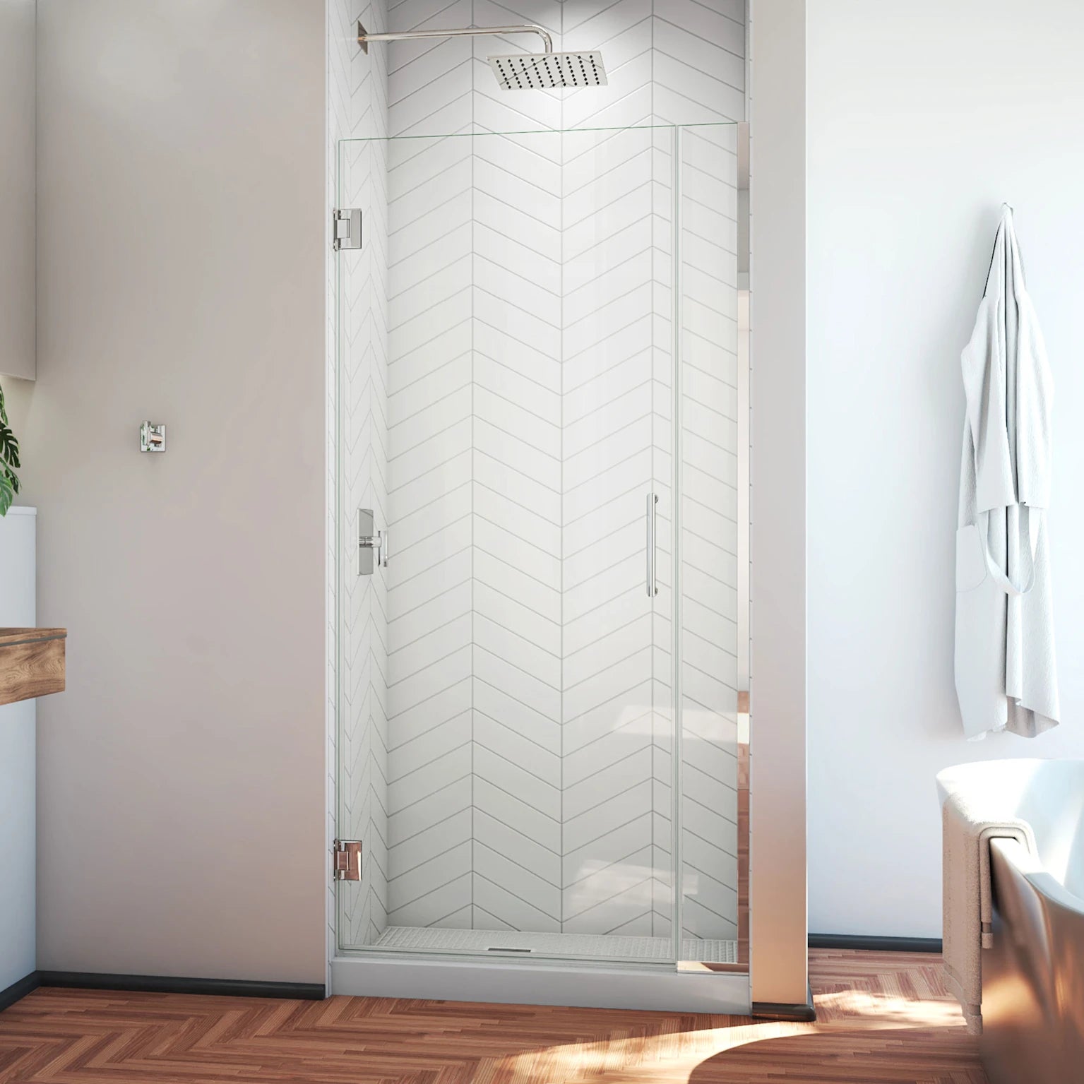 Transform your bathroom with the bright, modern clarity of the Unidoor Plus Frameless Hinged Shower Door. Its clear tempered glass and polished chrome hardware bring a crisp, open feel that enhances both minimalistic and patterned tile designs. Perfect for compact to mid sized openings, this frameless door delivers a refined, spa inspired aesthetic while maintaining reliable performance and smooth daily operation.