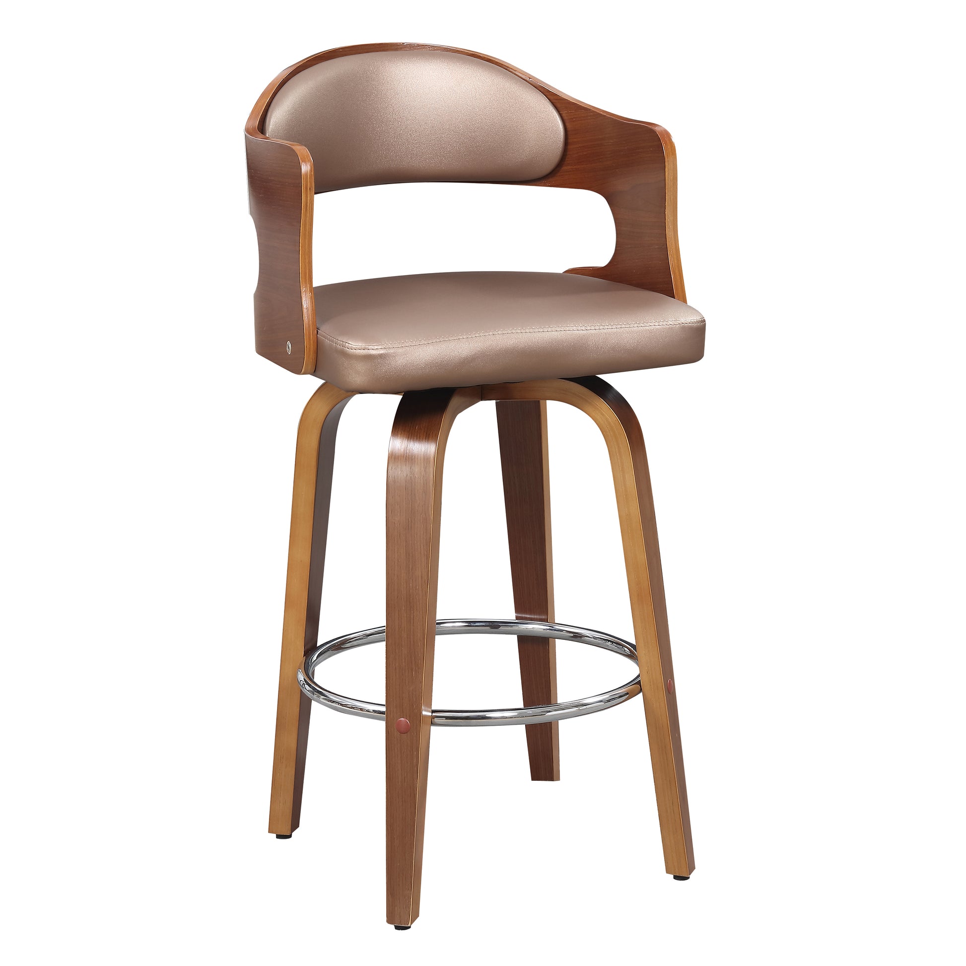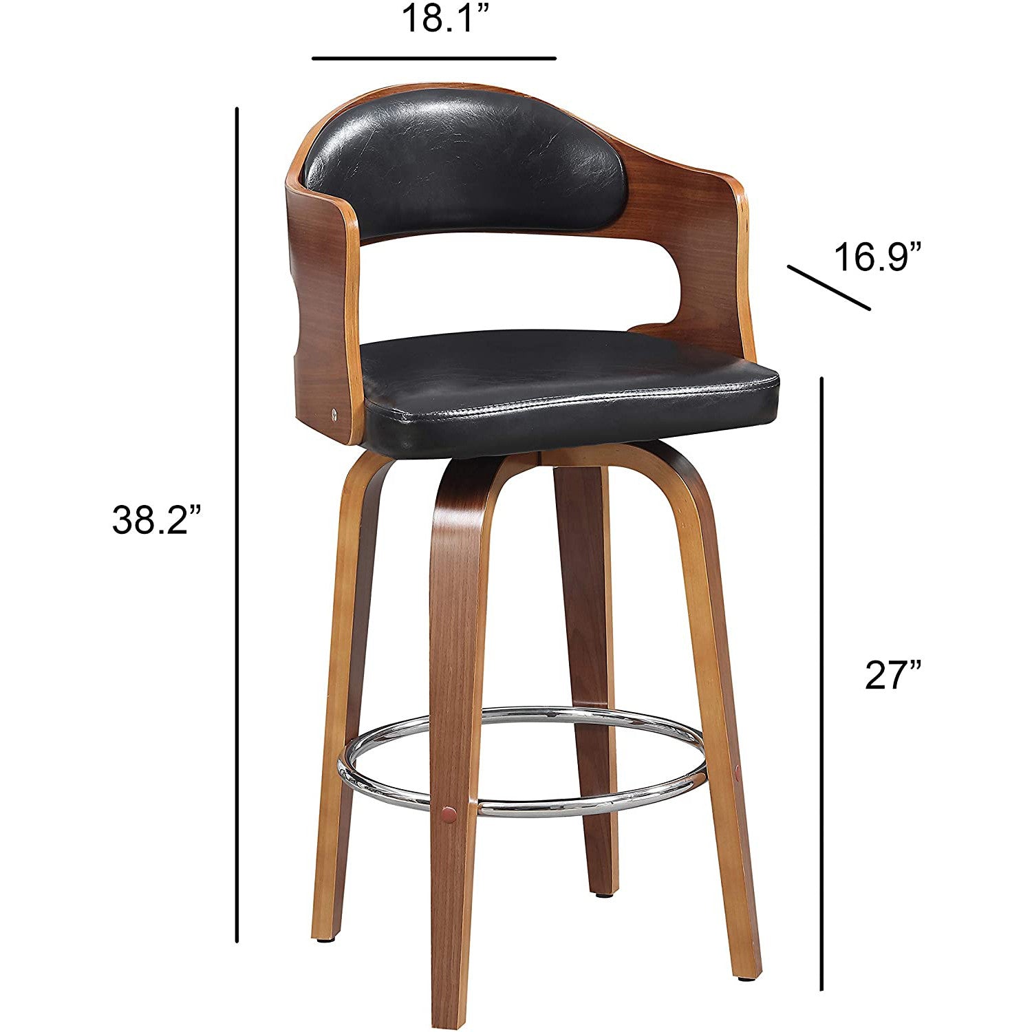 The simple mid-century design of this barstool is a gem not to be missed. Featuring curved wood, this counter height barstool is guaranteed to make a statement in your kitchen or any living space. The back and seat-cushion have been beautifully upholstered with black faux leather that defines the very essence of style. Designed with care, this wooden dining chair features sturdy construction and a footrest to reinforce its strength. Don’t forget that the seat swivels 360 degrees.
