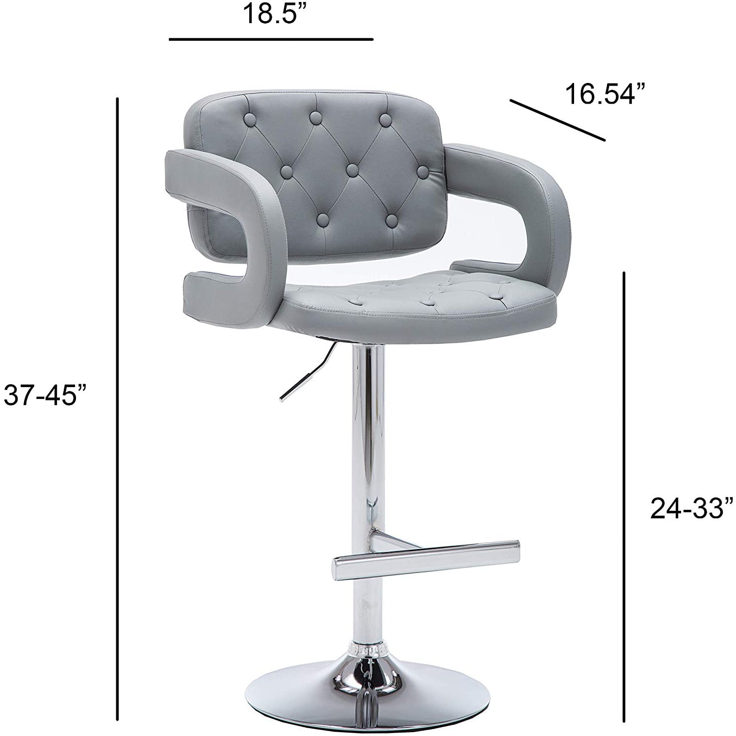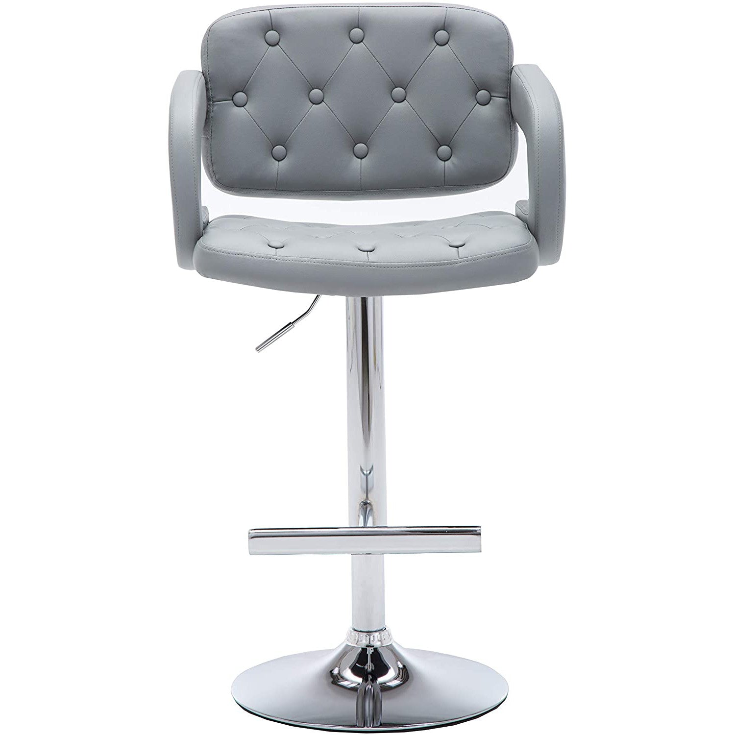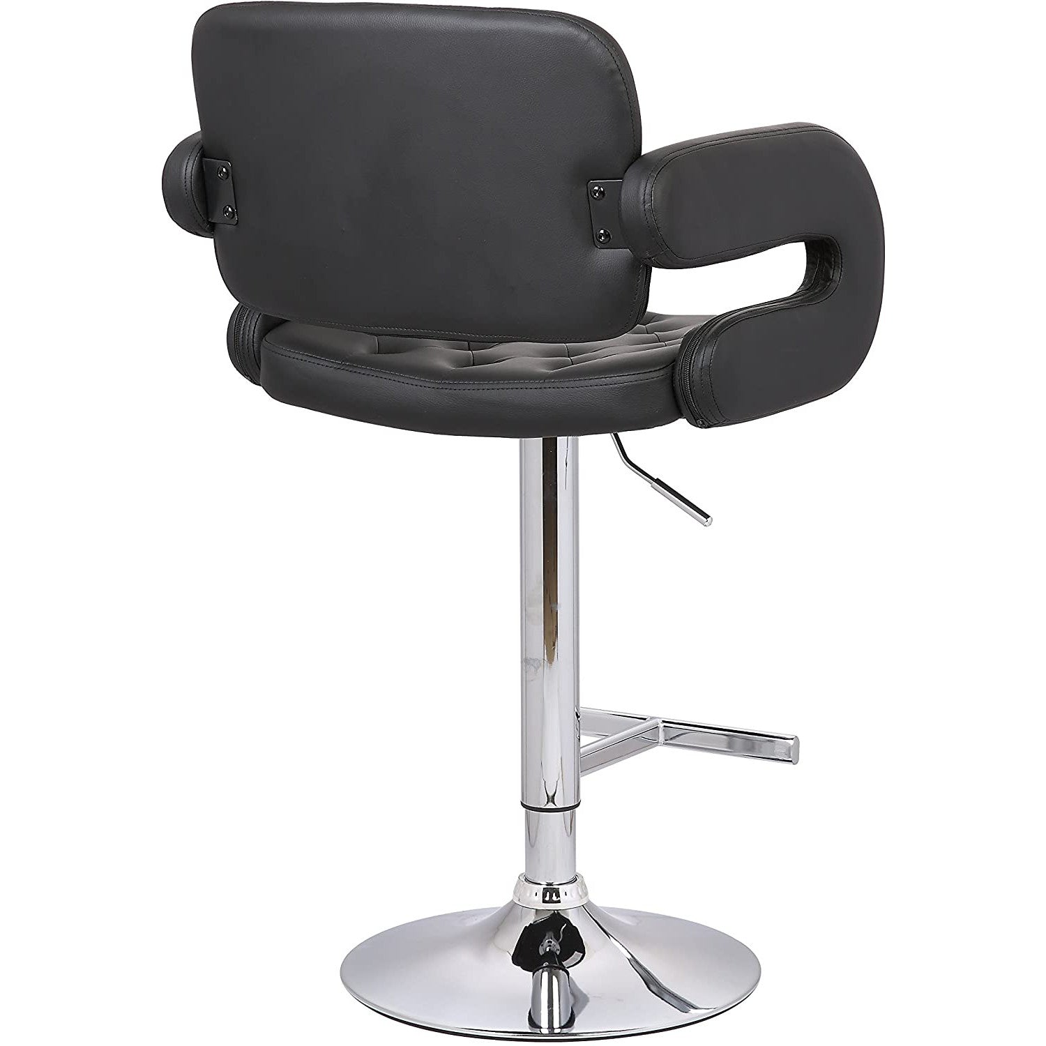 Barstool uses a metal pedestal base. A polished chrome foot rest adds to sturdy seating.