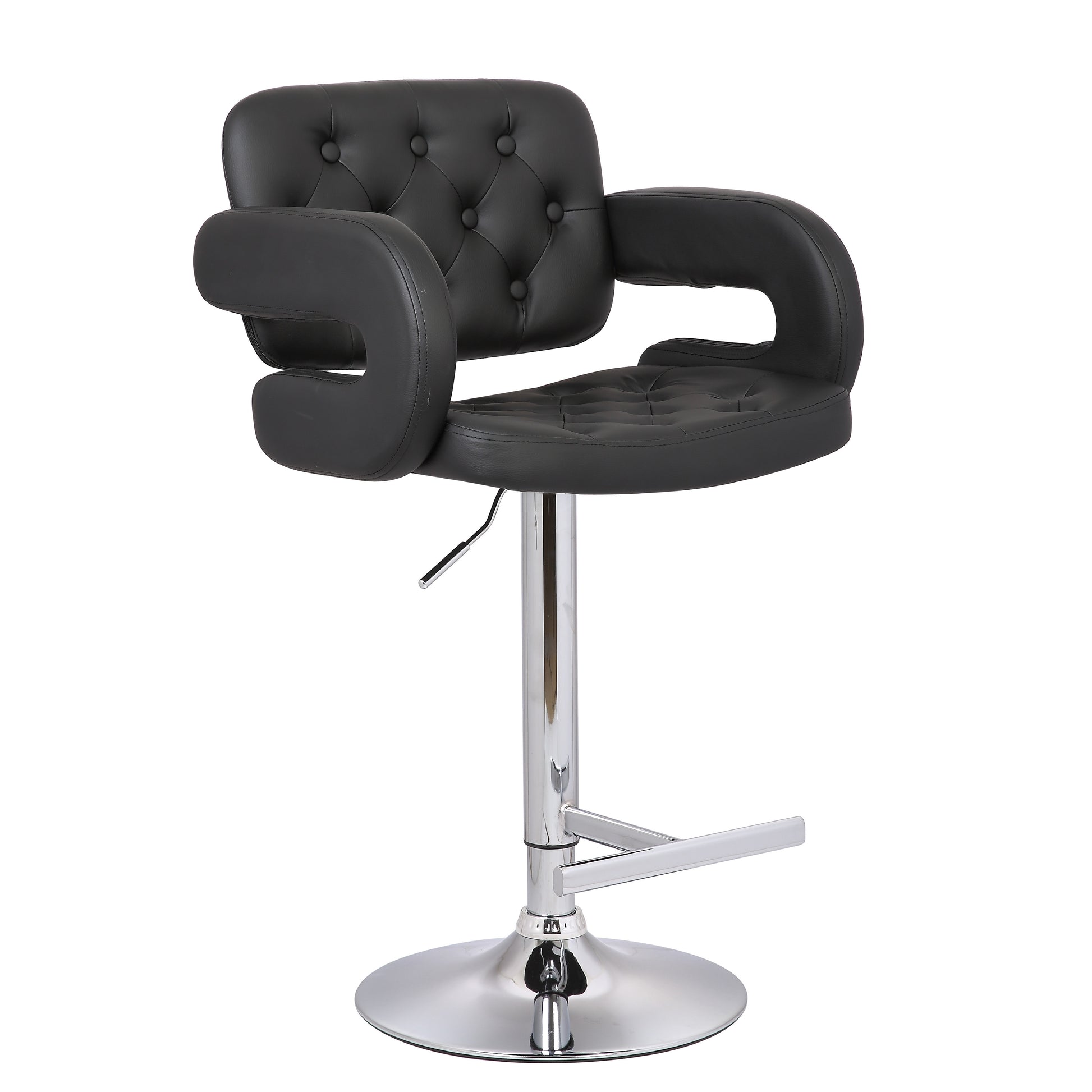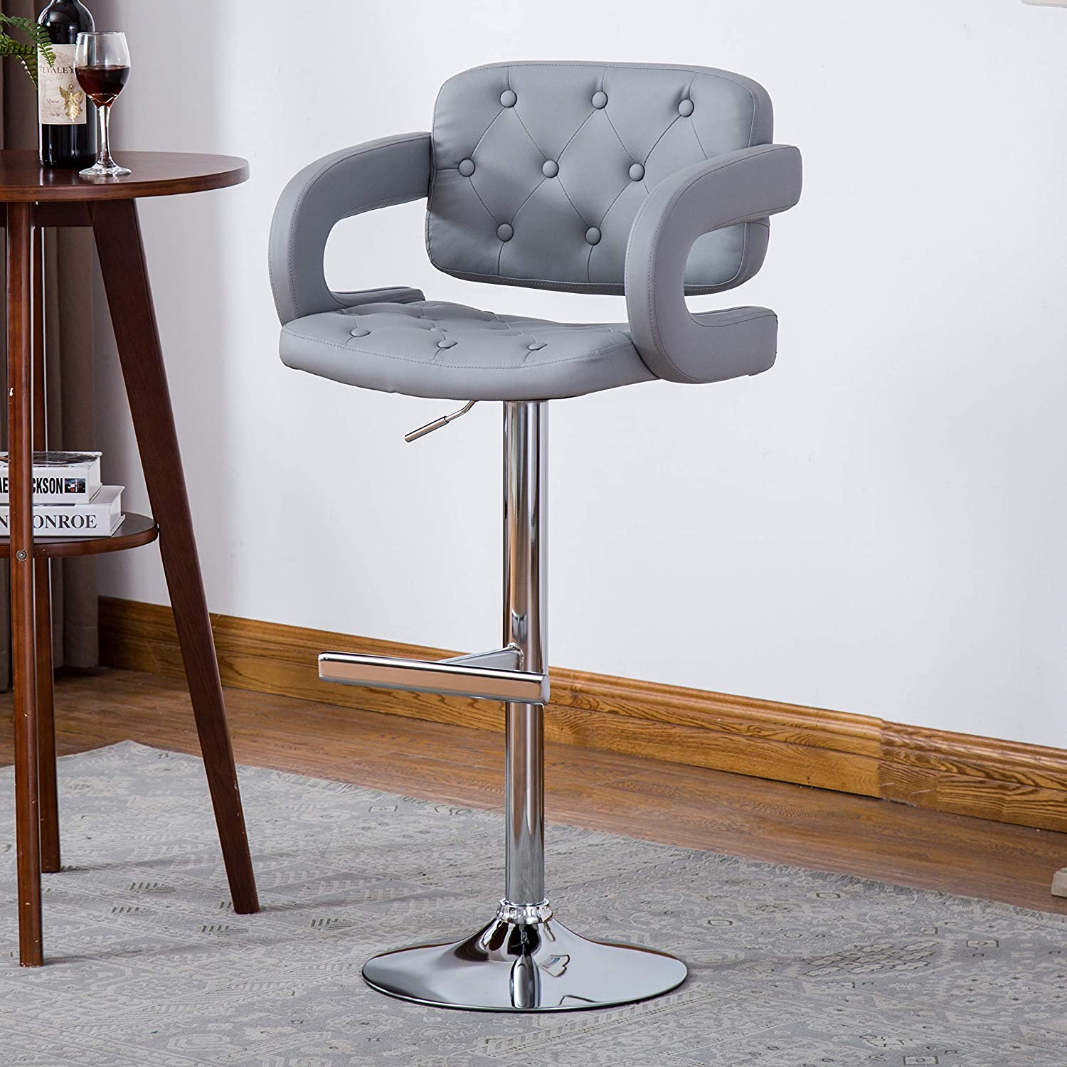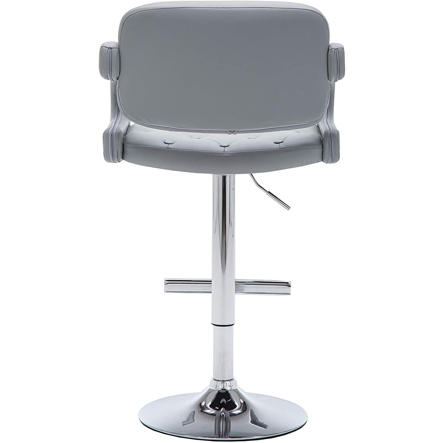 Barstool uses a metal pedestal base. A polished chrome foot rest adds to sturdy seating.