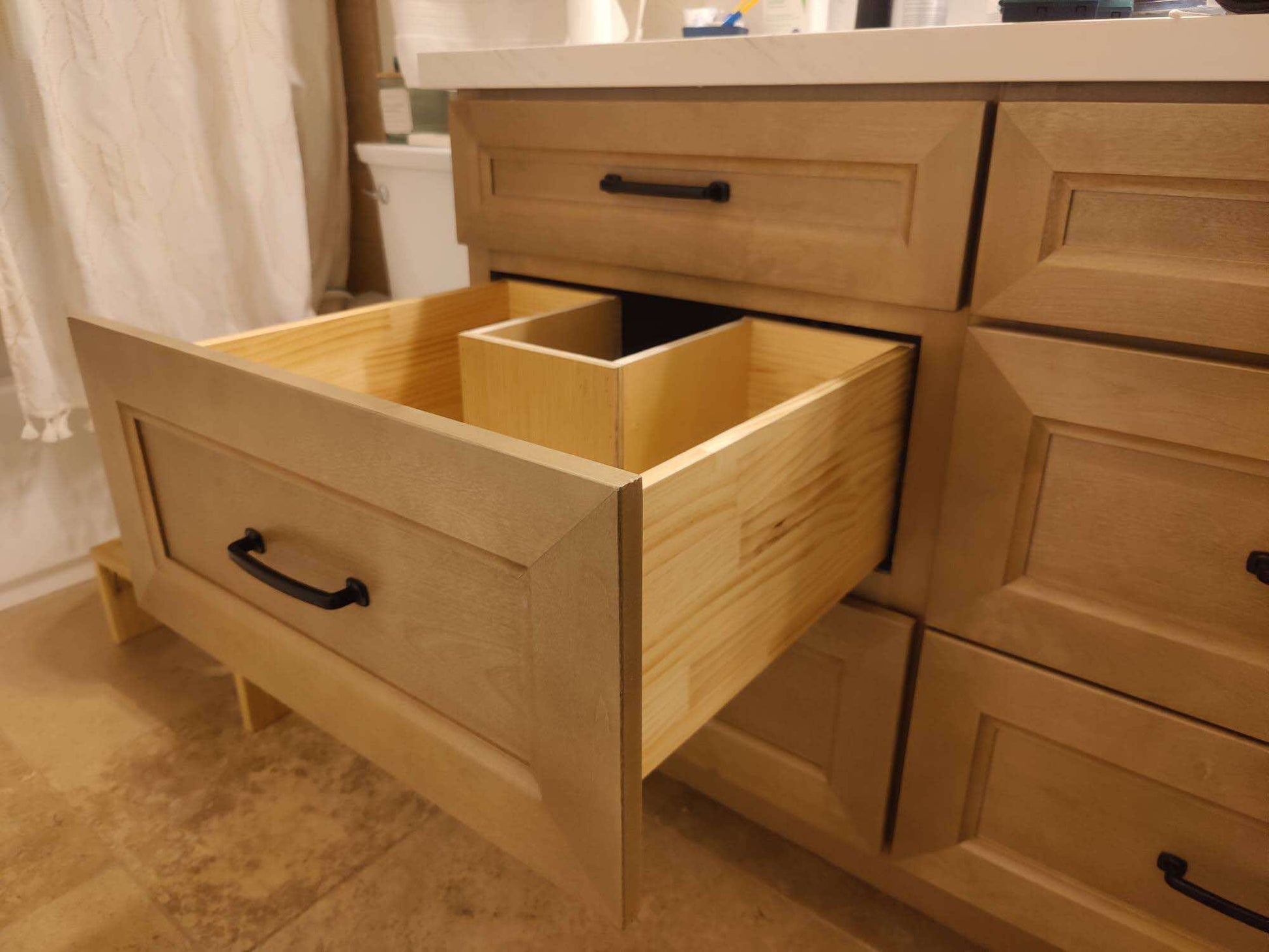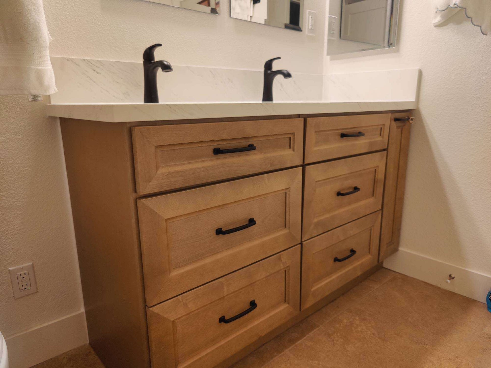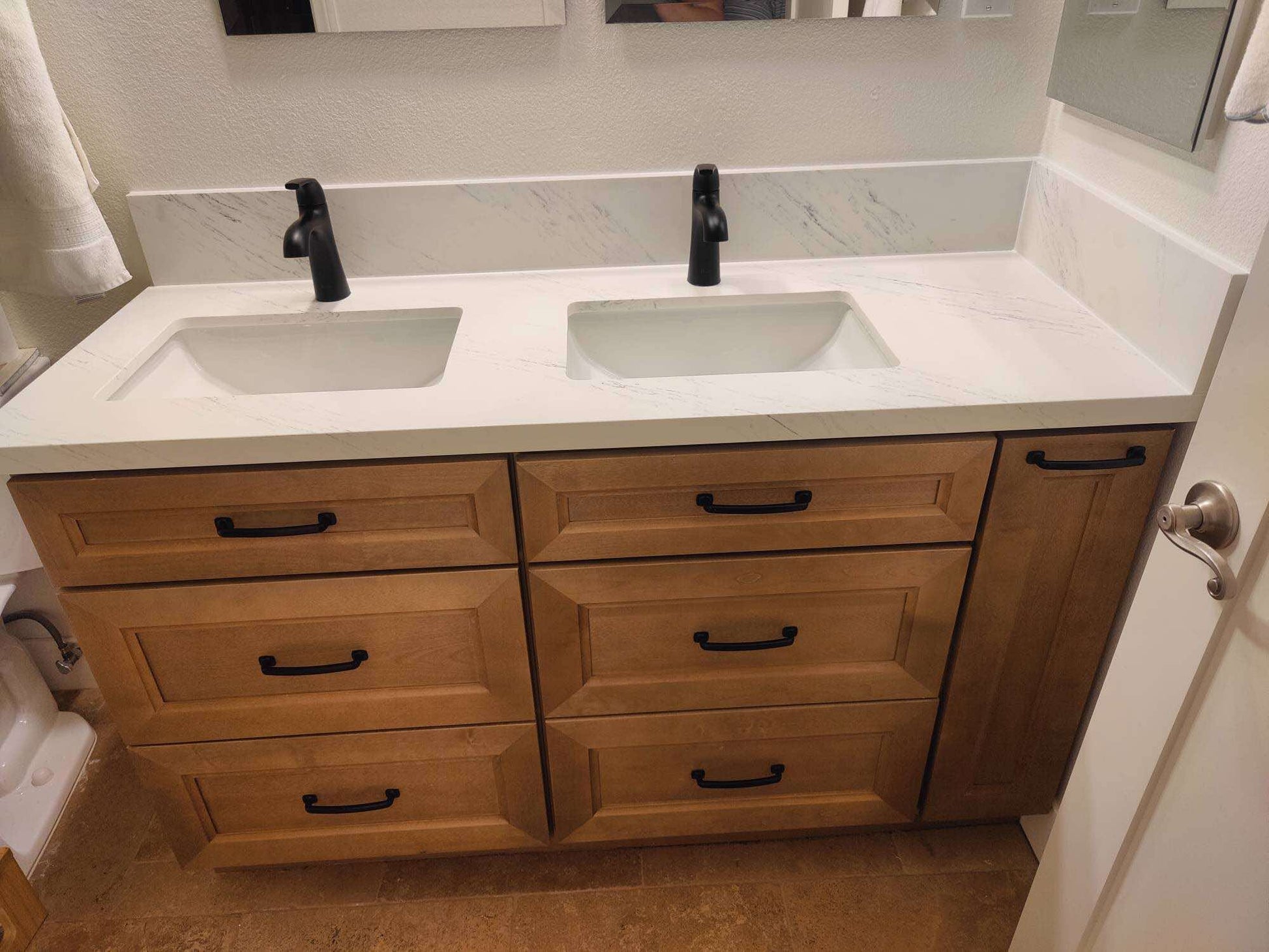Love this vanity - it was easy to install and looks great. Slight gap in between the two cabinets, but we don't mind too much. The seamless sinks & countertop are beautiful. Drawer space isn't amazing, but the soft close features and deep cabinets make up for it