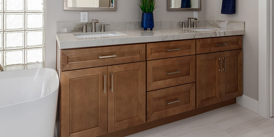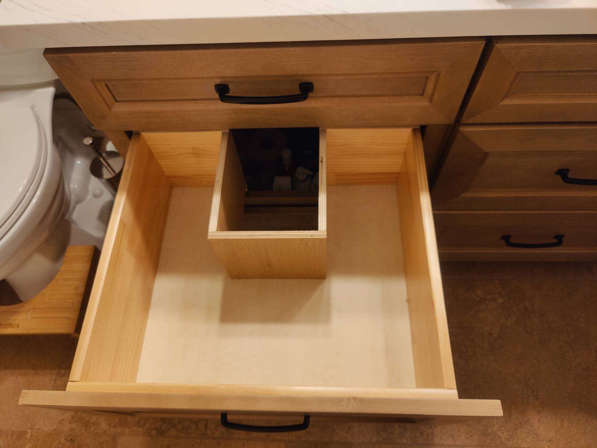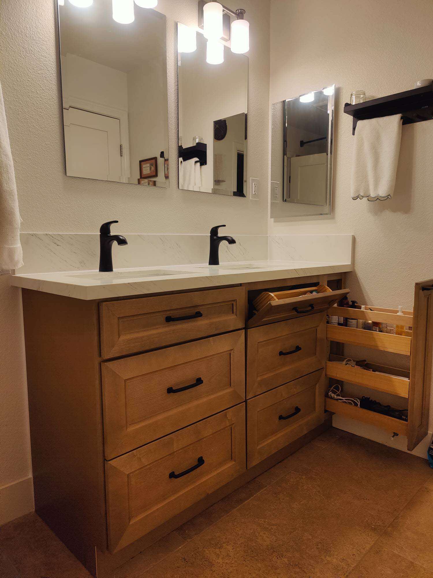Love this vanity - it was easy to install and looks great. Slight gap in between the two cabinets, but we don't mind too much. The seamless sinks & countertop are beautiful. Drawer space isn't amazing, but the soft close features and deep cabinets make up for it