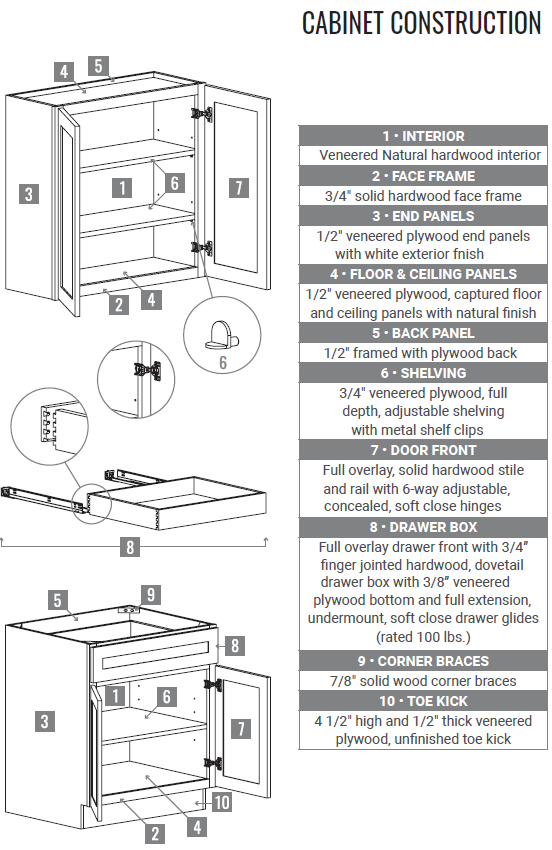 This product catalog has RTA cabinetry for kitchen and bath. These cabinets can also be installed into offices, walk-in closets, entertainment centers, laundry rooms, and more.