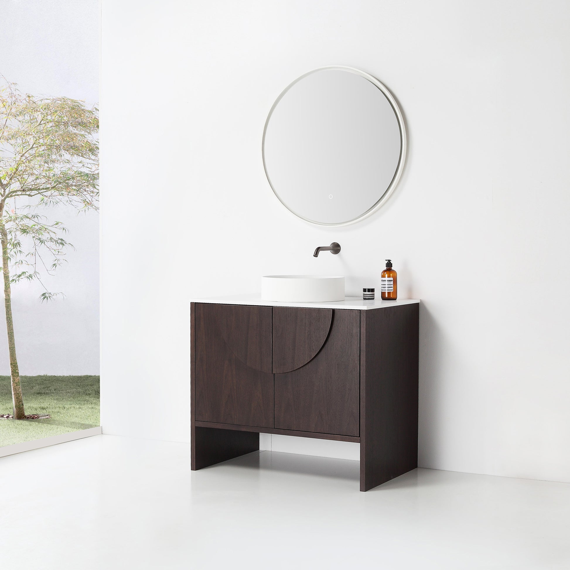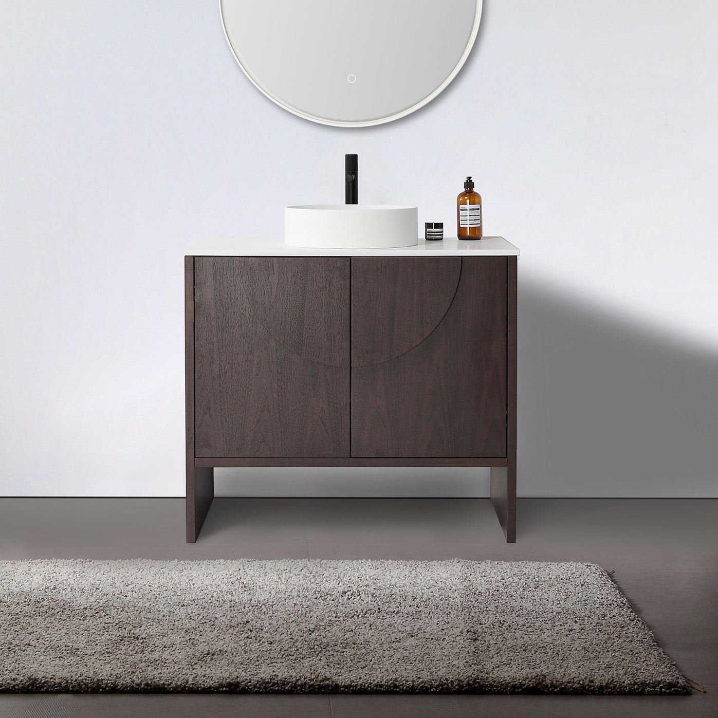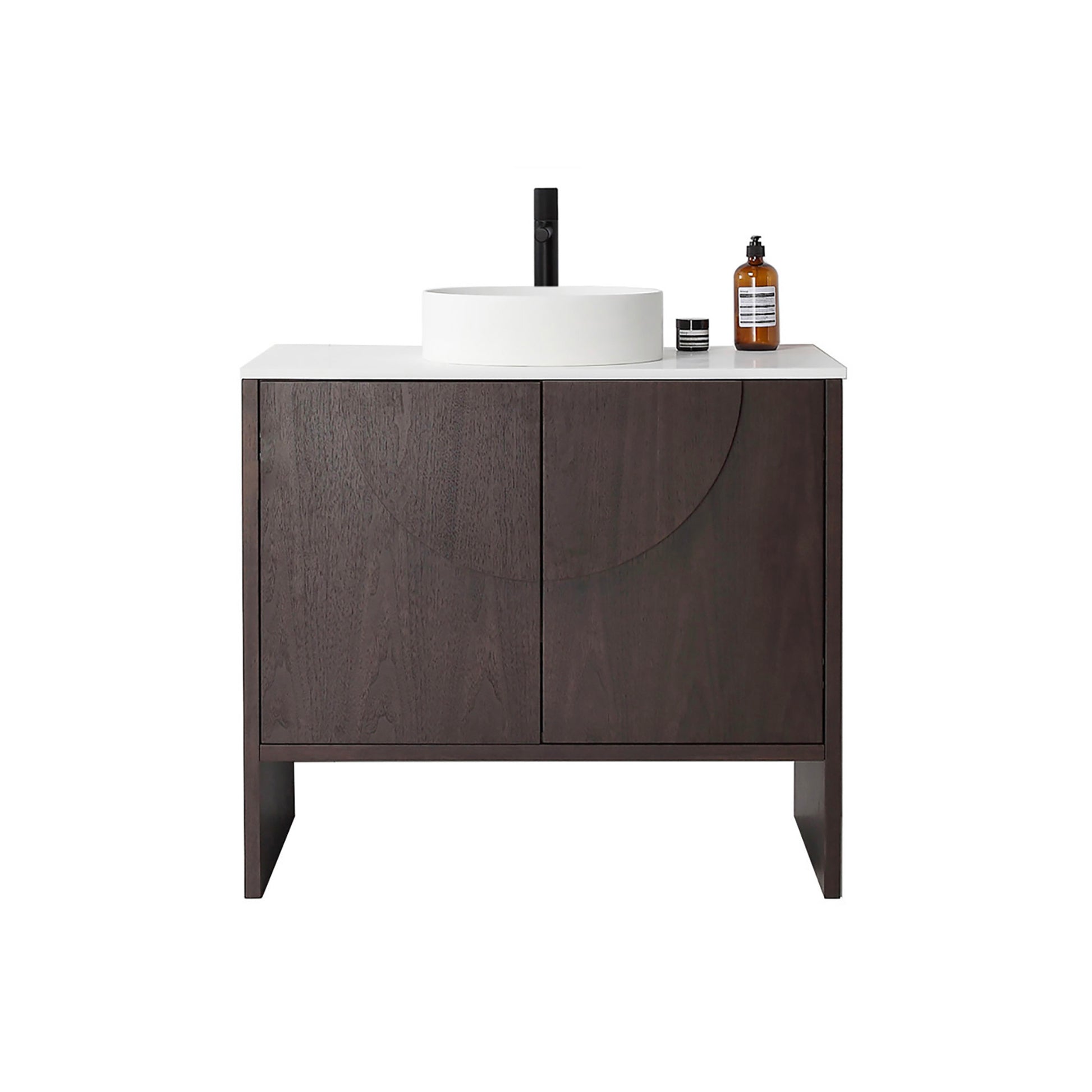 Celle 36" Bathroom Vanity in Dark Walnut or Pecan Oak with Matte Solid Surface Top and Vessel Sink